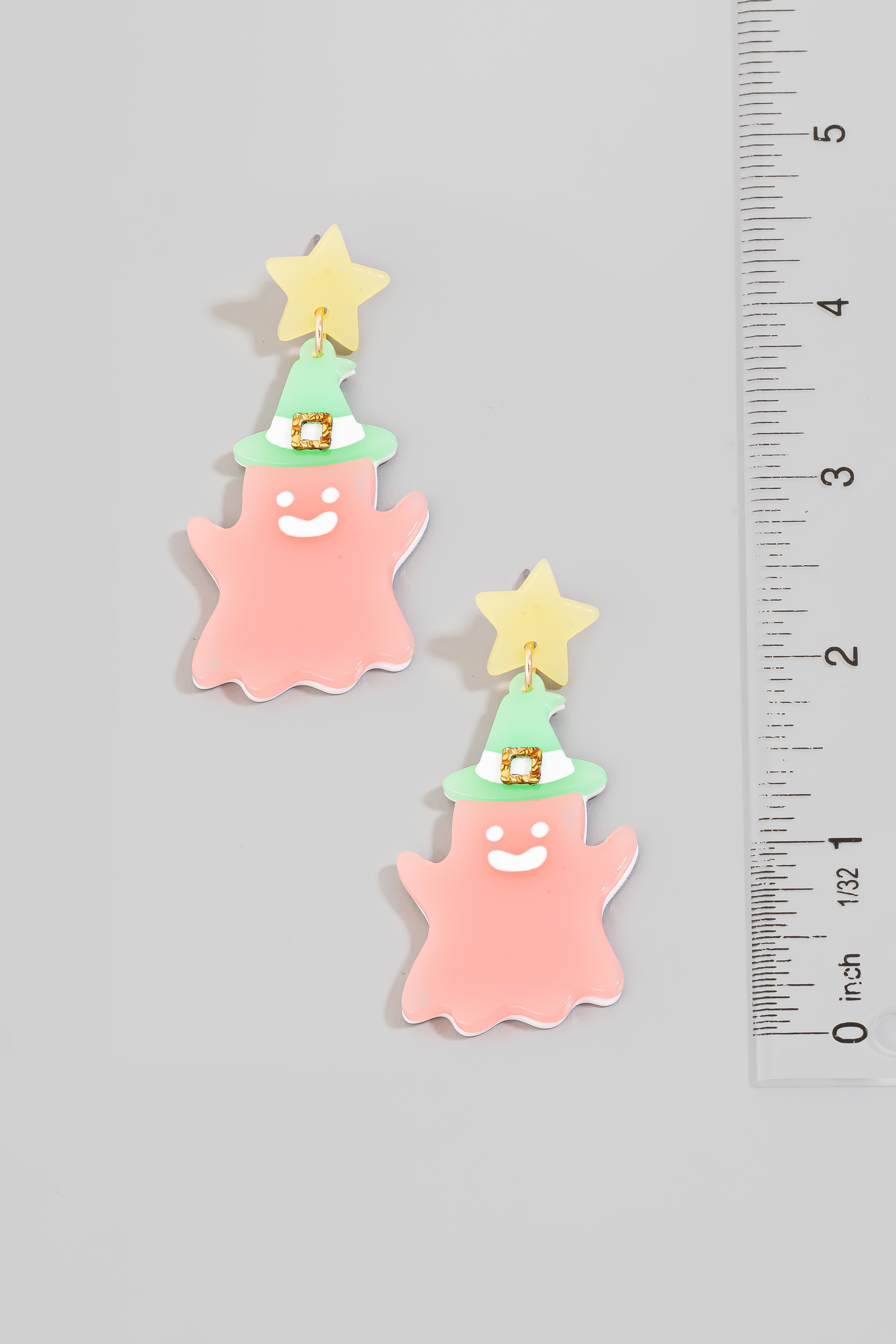 • This pair of dangle earrings introduces a unique glow in the dark witch hat ghost style. Unveil a new dimension of sophistication as this pair of dangle earrings effortlessly enhances the elegance of your ensemble.