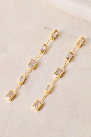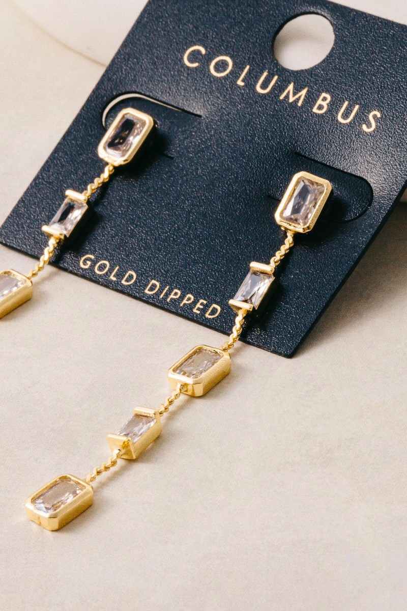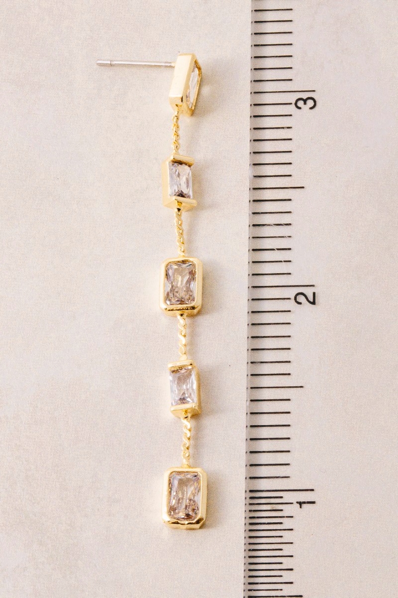 • This pair of drop earrings adds a modern gold dipped cubic zirconia baguette chain style. Witness the perfect fusion of style and functionality as this pair of drop earrings effortlessly complements your lifestyle.