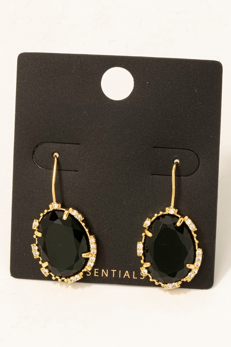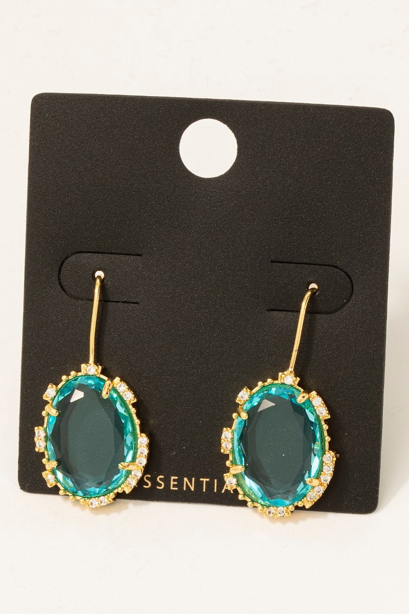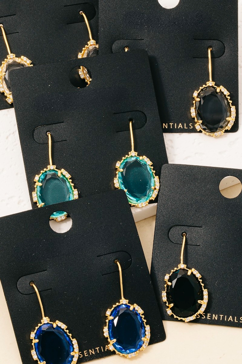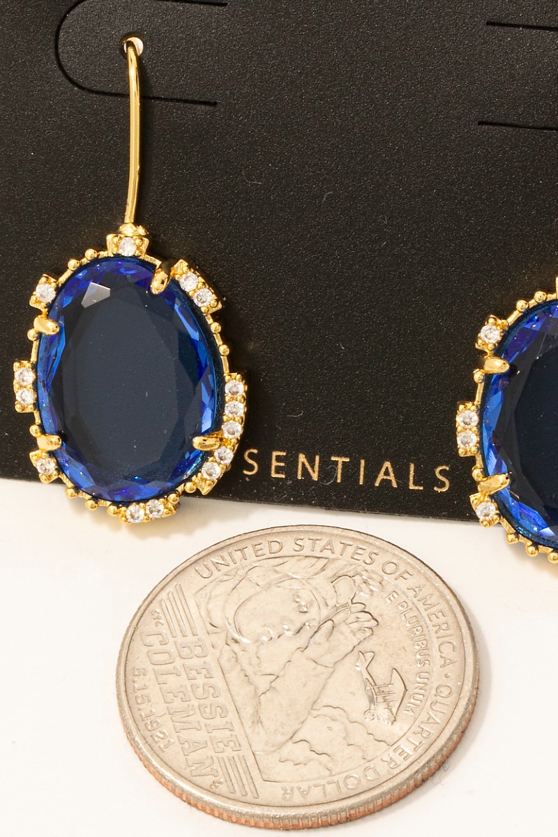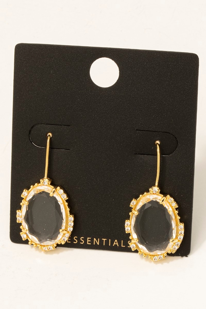 • This pair of dangle earrings brings a unique gold dipped cubic zirconia and glass oval gem style. Experience refined sophistication with this understated yet stylish piece.