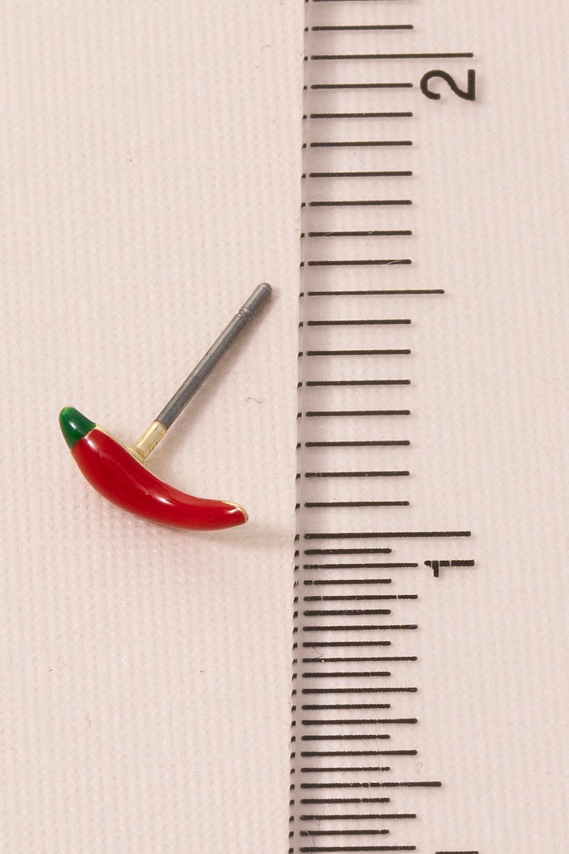 • This pair of stud earrings showcases a unique gold dipped enamel chili pepper style. Witness the perfect fusion of style and functionality as this pair of stud earrings effortlessly complements your lifestyle.