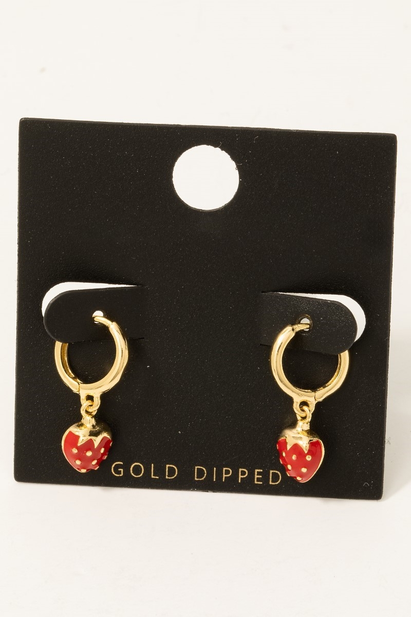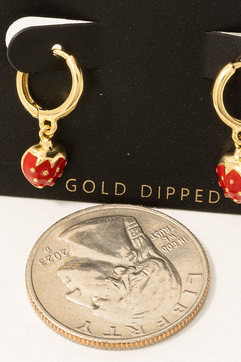 - This pair of hoop earrings brings a unique gold dipped epoxy strawberry charms style. Immerse yourself in the details of design, as this pair of hoop earrings effortlessly becomes a conversation starter.
