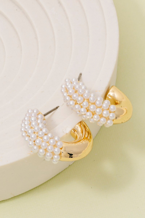 • This pair of hoop earrings adds a modern gold dipped half pearl pave style. Celebrate the art of accessorizing with this piece that effortlessly encapsulates modern trends.