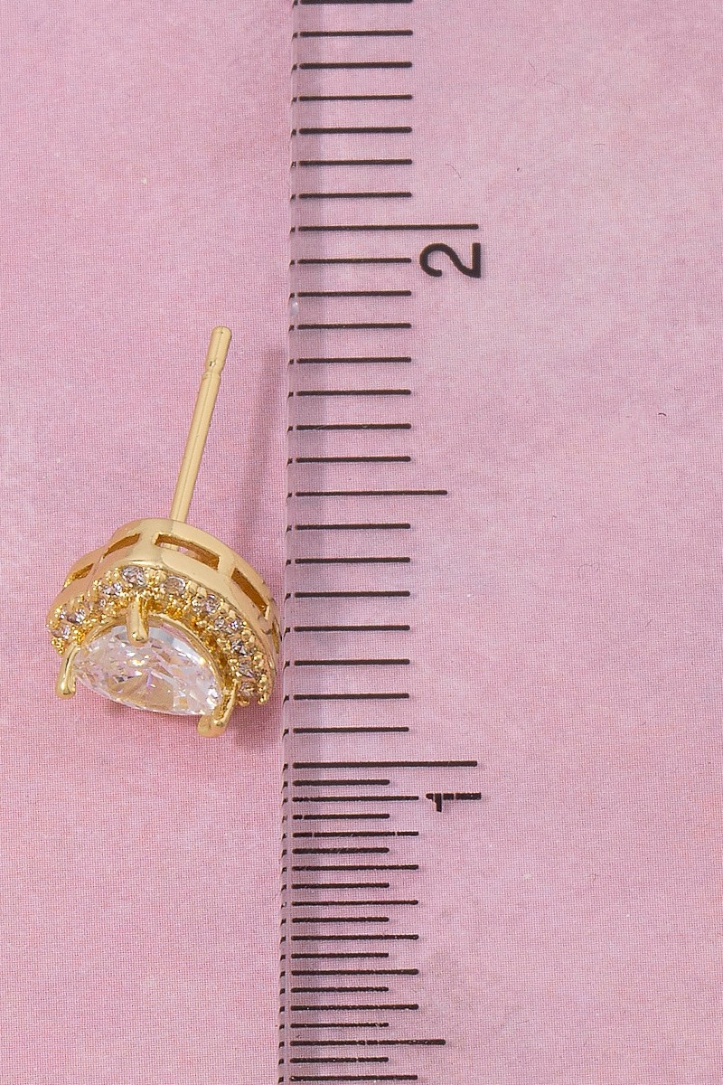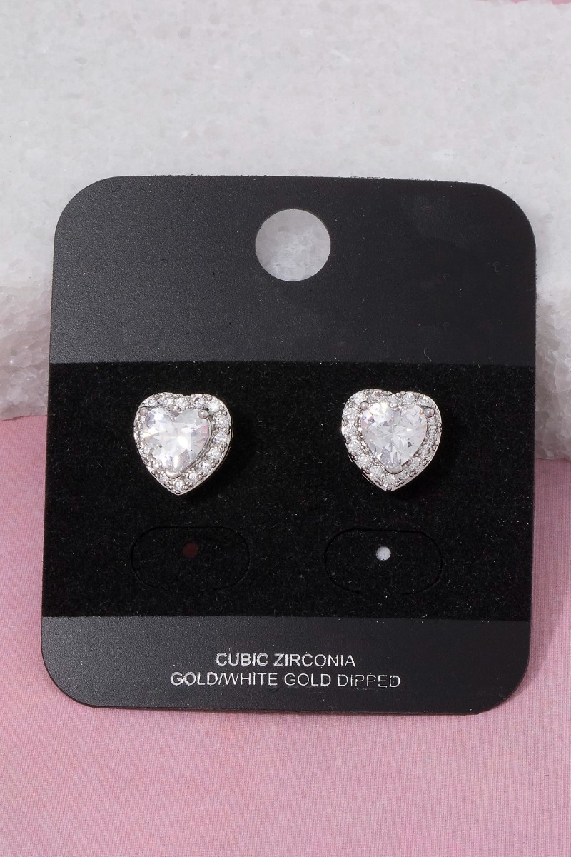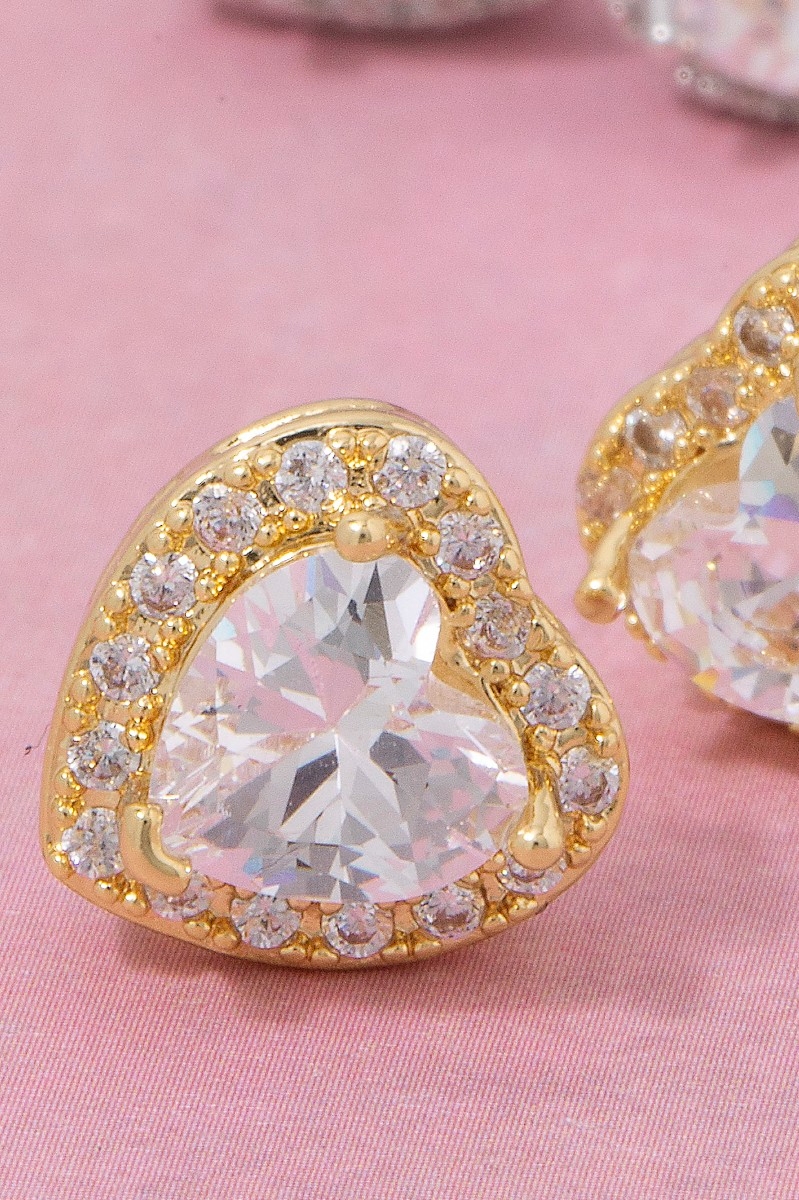 • This pair of stud earrings features a fashionable gold dipped heart halo cubic zirconia style. Unveil modern elegance with this subtly intricate pair of stud earrings.