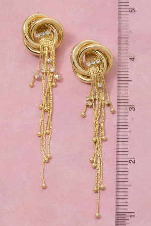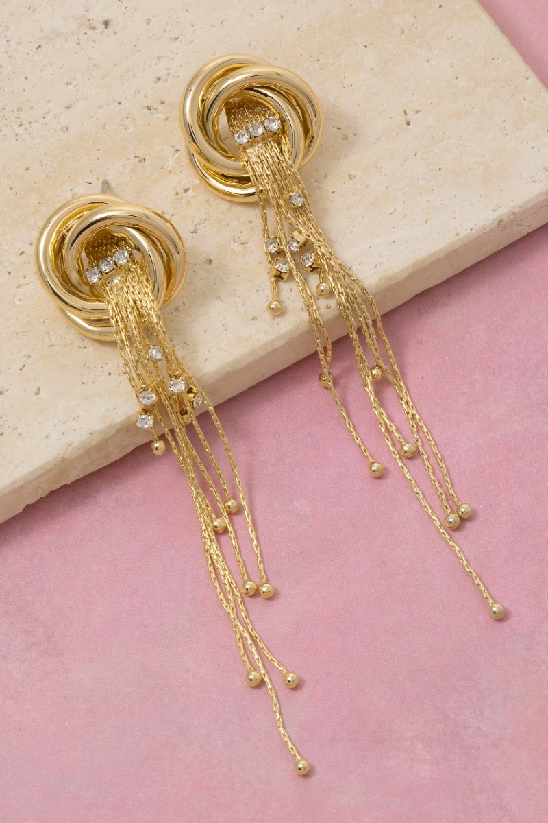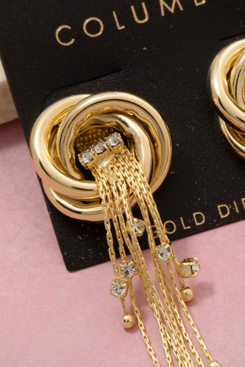 - This pair of stud earrings adds a modern gold dipped knot and long chain fringe style. Explore a blend of classic charm and contemporary flair.