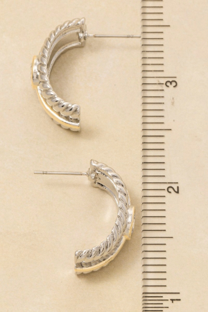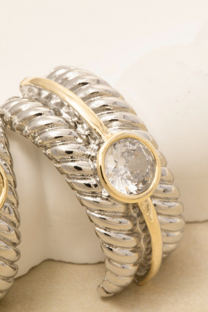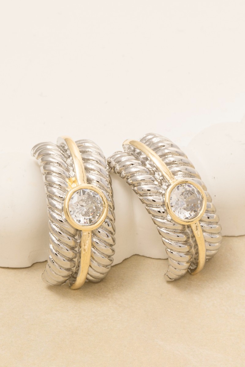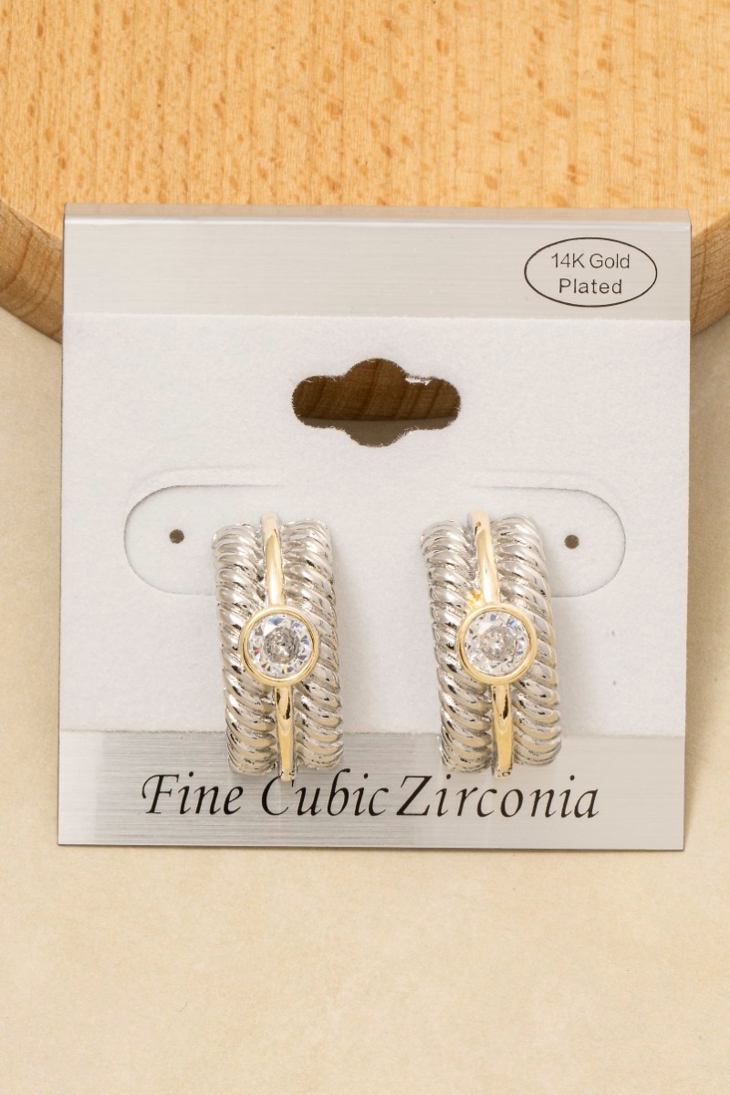 • This pair of earrings displays a vibrant gold dipped two tone cubic zirconia stud rope pattern style. Elevate your ensemble with this chic, timeless pair of earrings.