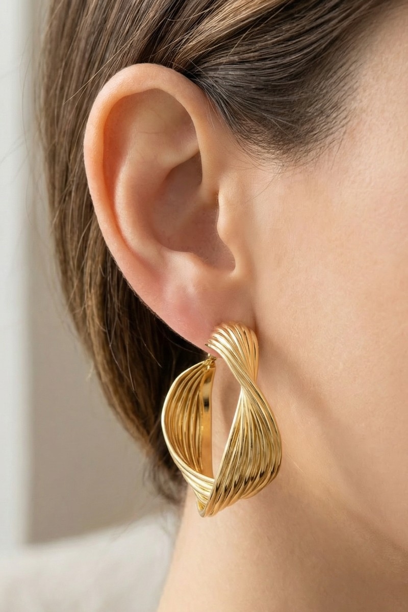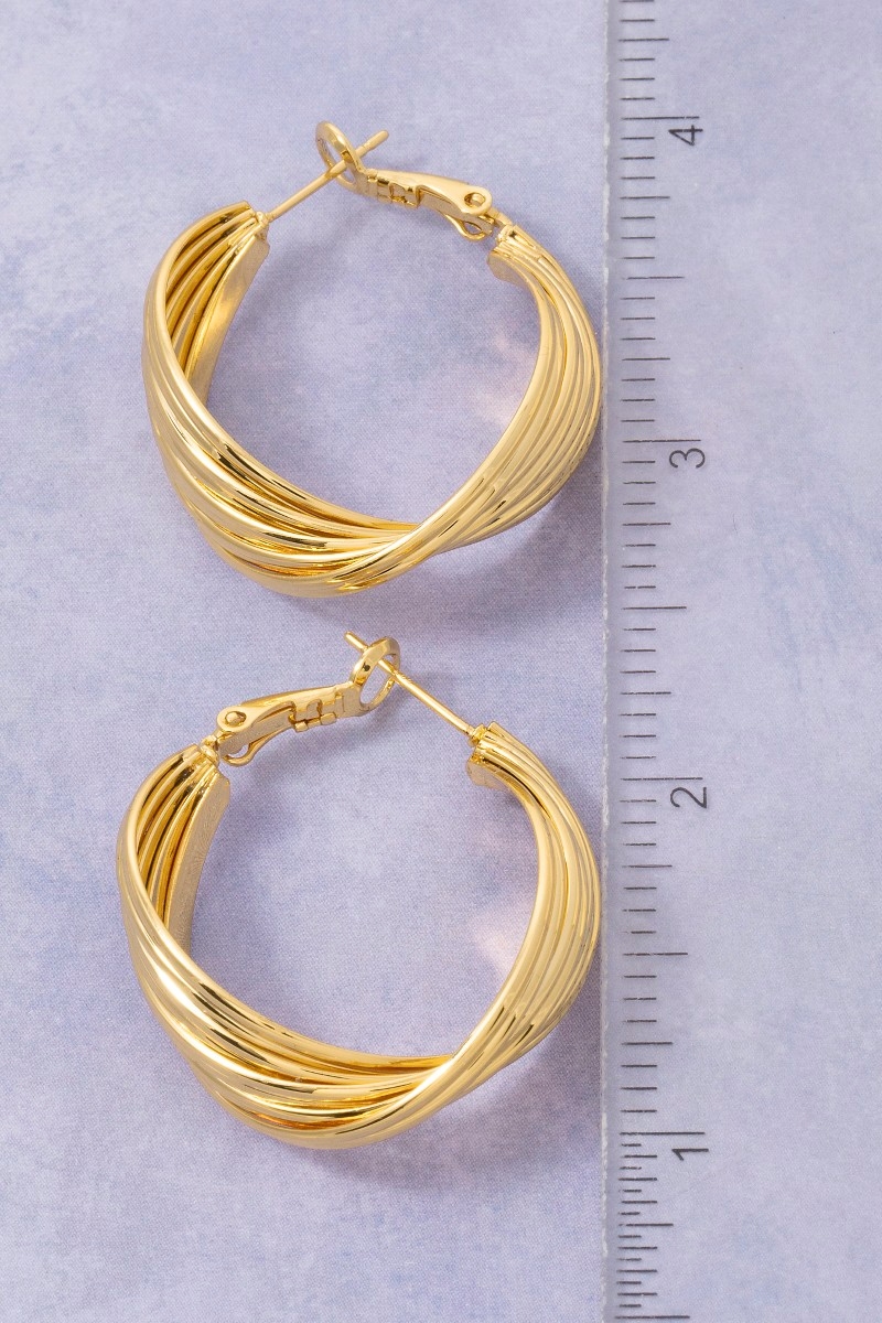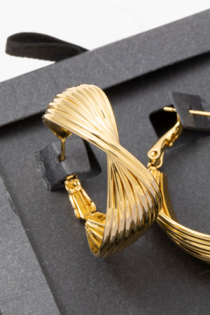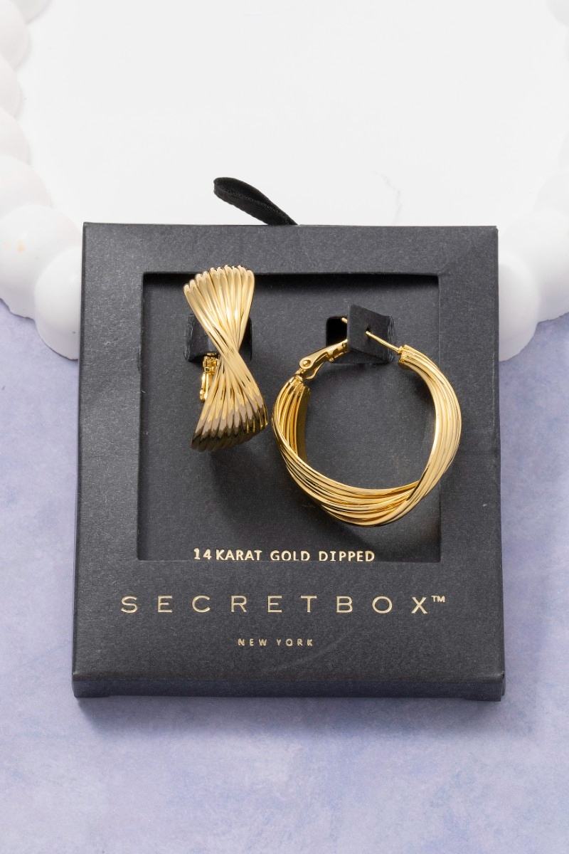 • This pair of hoop earrings brings a unique secret box gold dipped 25mm twisted style. Elevate your ensemble with this chic, timeless pair of hoop earrings.