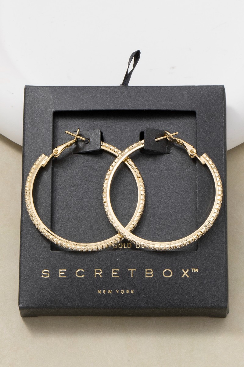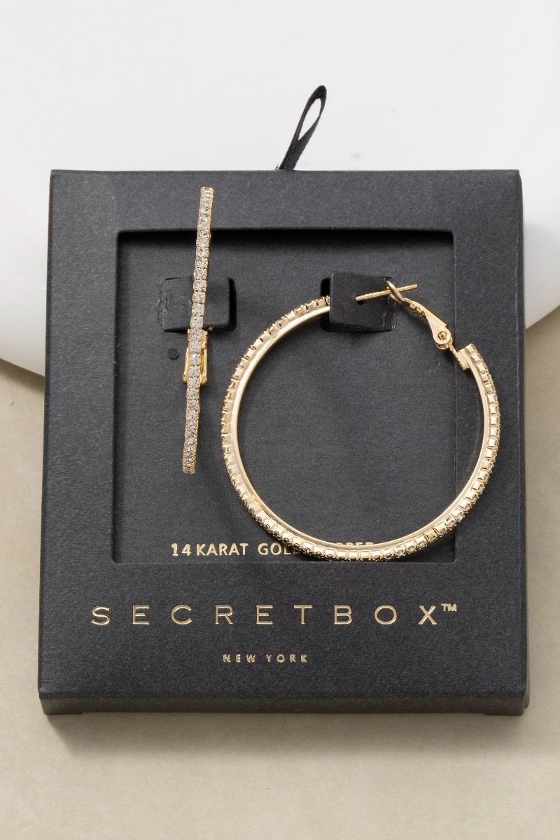- This pair of hoop earrings showcases a timeless secret box gold dipped cubic zirconia latch style. Discover the perfect balance of subtlety and flair as this pair of hoop earrings effortlessly completes your look.