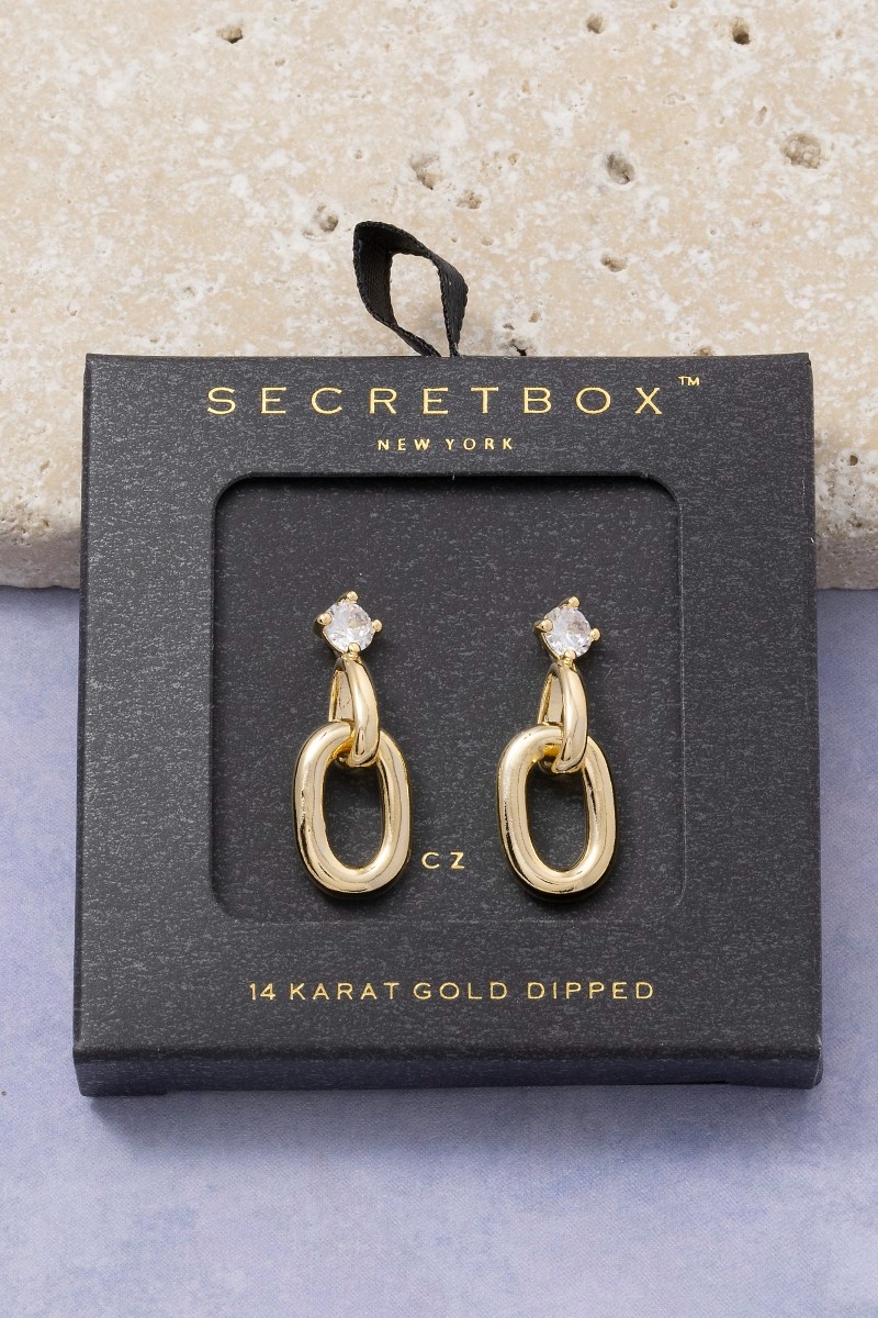 - This pair of drop earrings displays a fashionable secret box gold dipped cubic zirconia oval linked style. Experience a subtle blend of modernity and classic charm as this pair of drop earrings effortlessly adorns your ensemble.