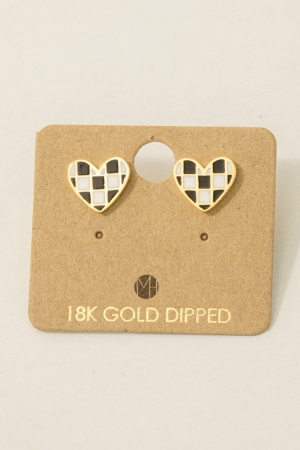 - This trending pair of earrings displays a vibrant gold dipped epoxy checkered heart stud earrings style. Discover the perfect balance of subtlety and flair as this trending pair of earrings effortlessly completes your look.