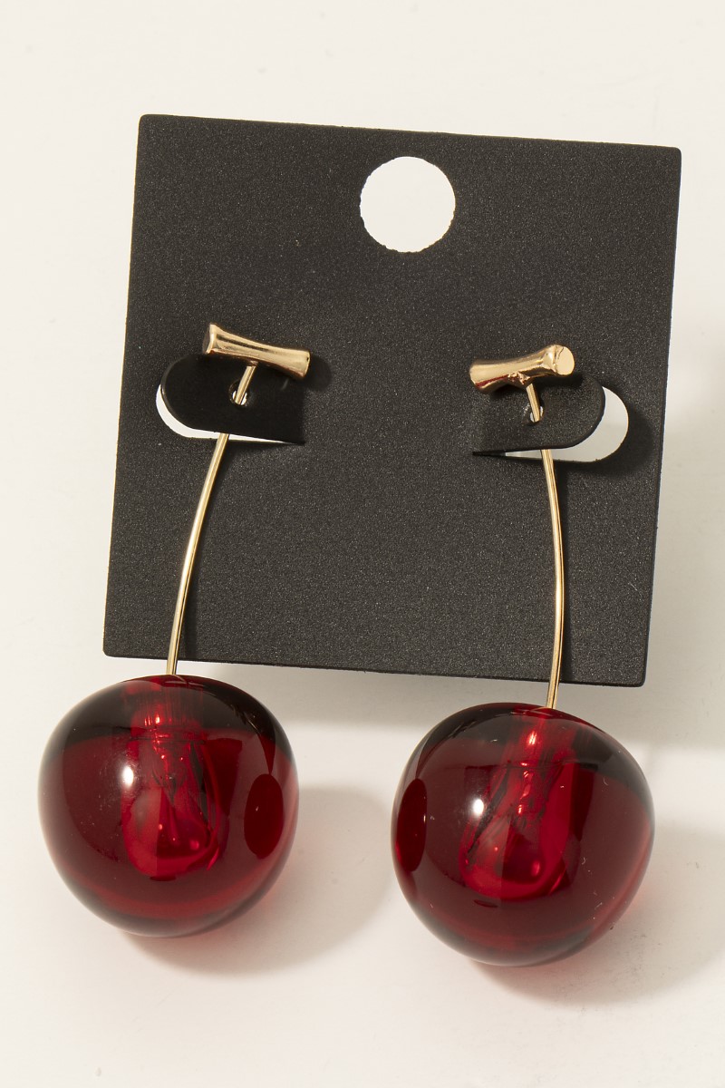• This pair of dangle earrings brings a unique gold dipped resin cherry threader style. Experience refined sophistication with this understated yet stylish piece.