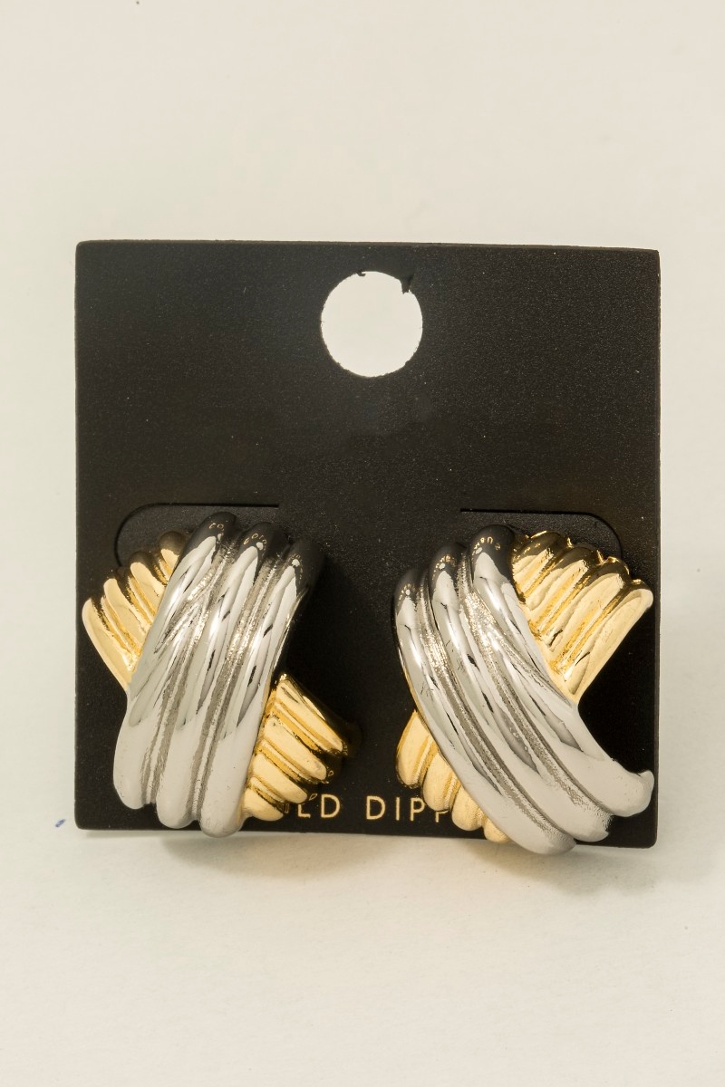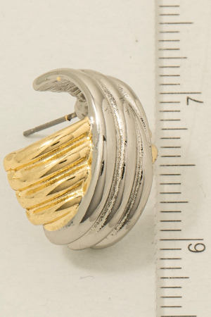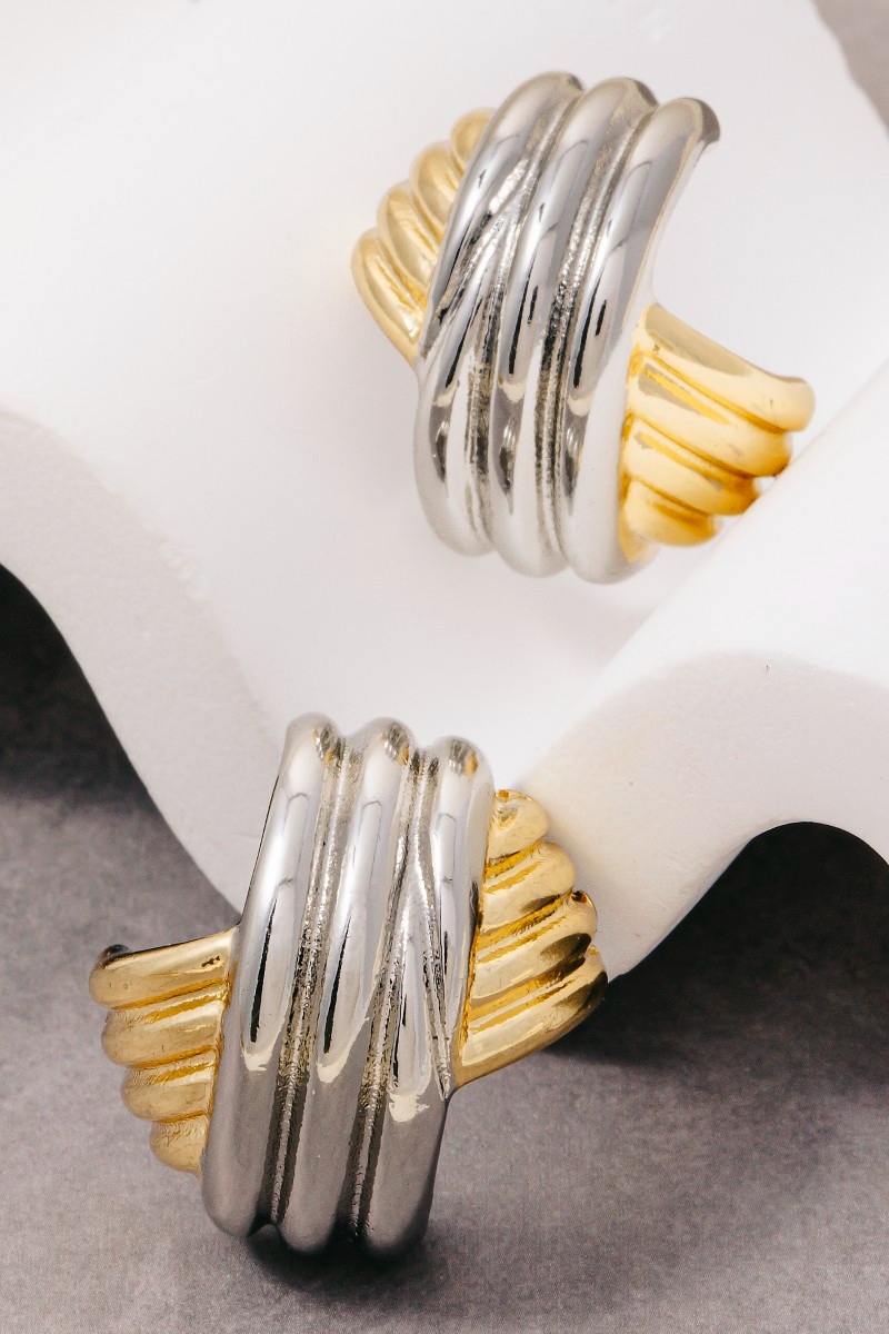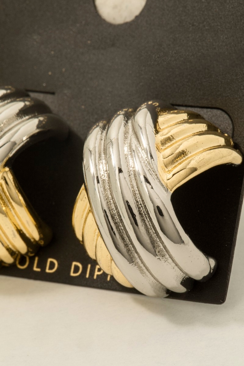 • This pair of hoop earrings brings a stunning gold dipped two tone hash layered style. Savor the craftsmanship that goes beyond the ordinary, as this pair of hoop earrings effortlessly captivates attention.