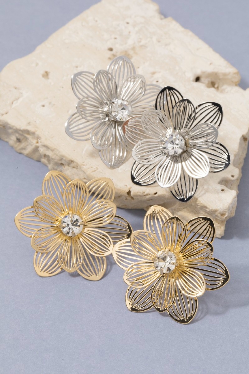 • This pair of stud earrings showcases a unique gold filigree daisy flower with crystal center style. Savor the allure of detailed craftsmanship in this exquisite pair of stud earrings.