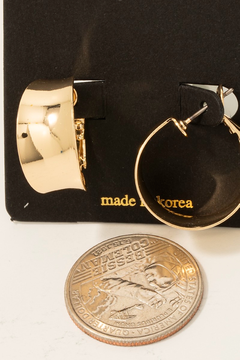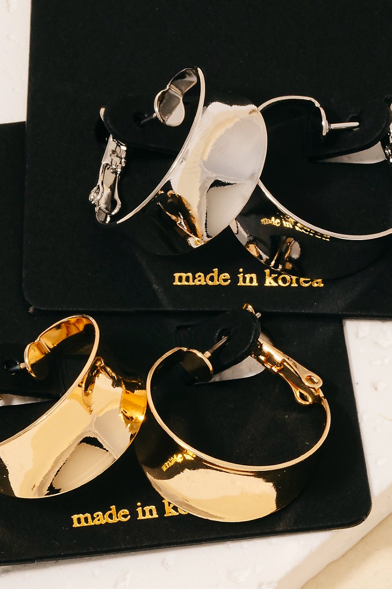 - This pair of hoop earrings brings a luxurious flat wide latch style. Revel in the intricate design that effortlessly distinguishes this pair of hoop earrings, making it a statement piece.