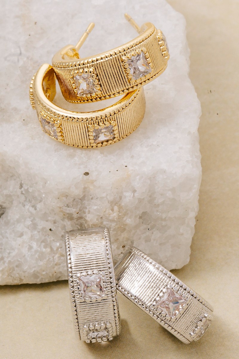 - This pair of hoop earrings displays a fashionable gold dipped square cubic zirconia wide style. Indulge in the allure of exquisite craftsmanship as this pair of hoop earrings effortlessly adds a touch of luxury to your attire.