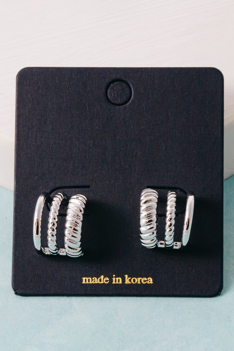 - This pair of hoop earrings showcases a timeless wide layered mini style. Revel in the intricate design that effortlessly distinguishes this pair of hoop earrings, making it a statement piece.