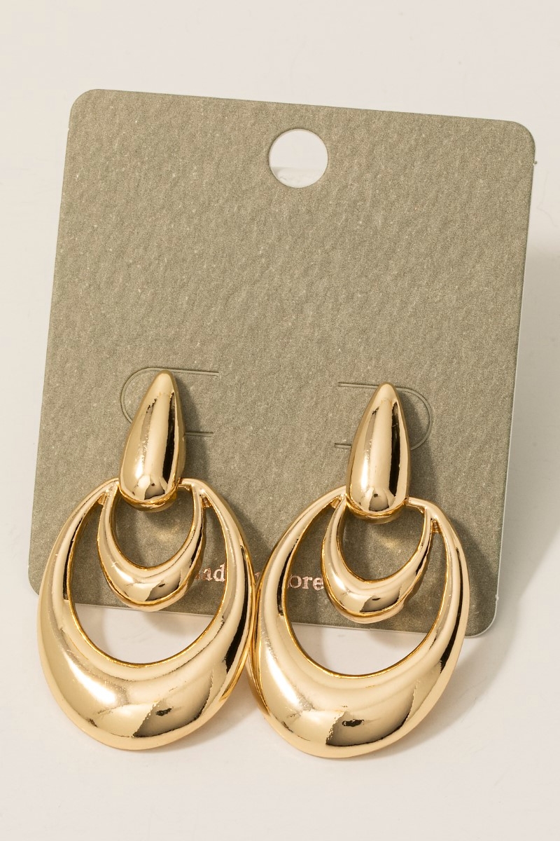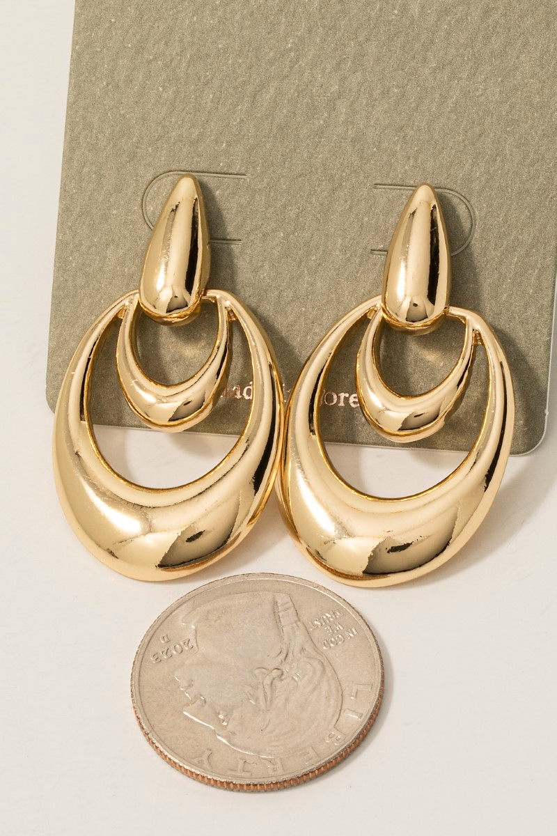 - This pair of earrings brings a unique layered abstract metallic door knocker style. Elevate your ensemble with this chic, timeless pair of earrings.
