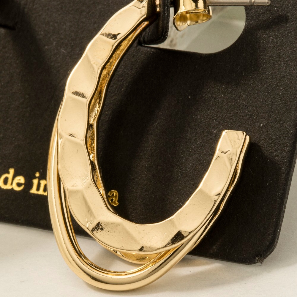 • This pair of hoop earrings brings a luxurious layered metallic textured oval style. Embark on a journey of sartorial refinement as this pair of hoop earrings effortlessly complements your fashion sense.