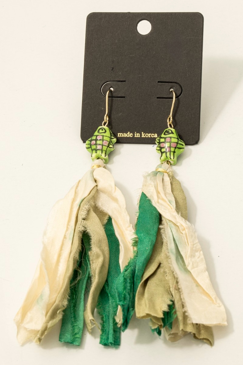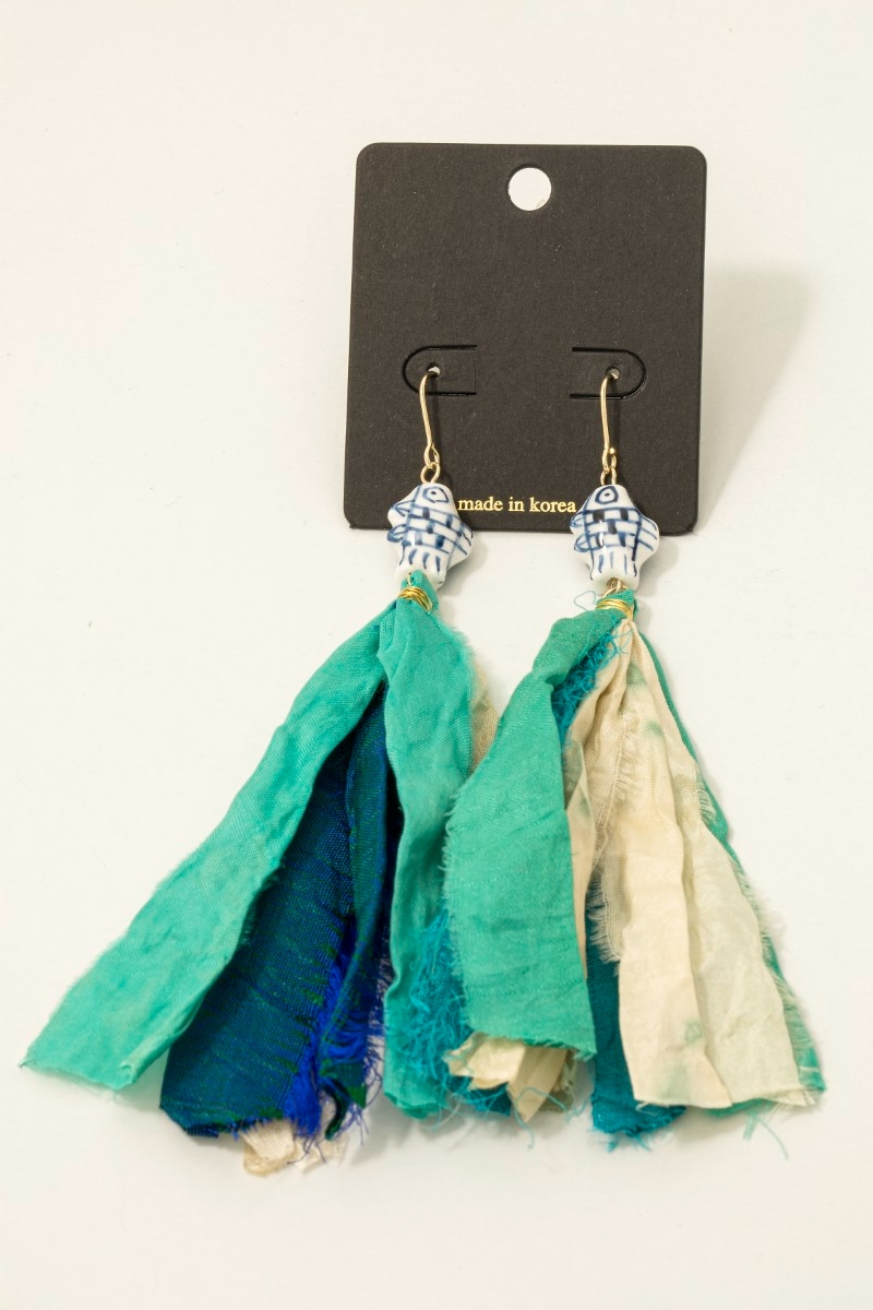- This pair of drop earrings displays a vibrant ceramic fish multi fabric fringe style. Savor the craftsmanship that goes beyond the ordinary, as this pair of drop earrings effortlessly captivates attention.