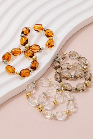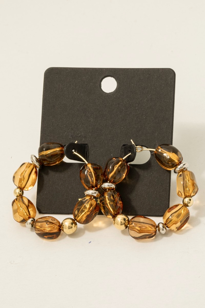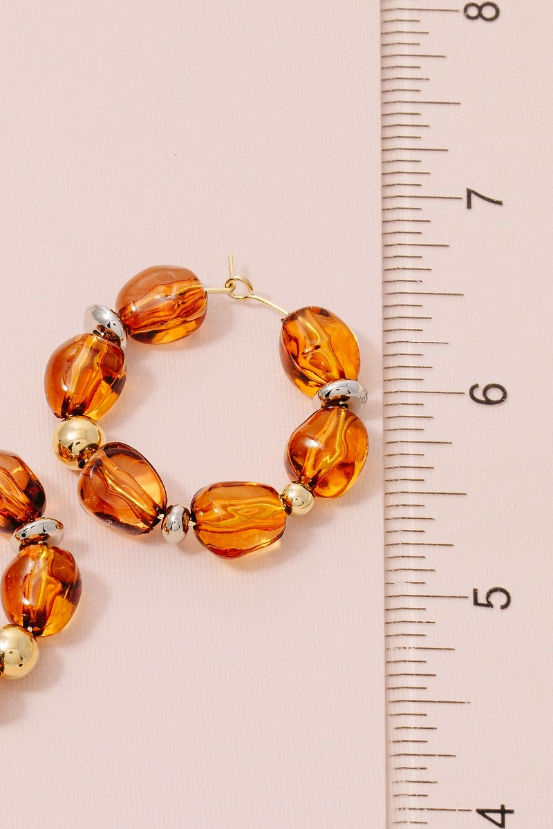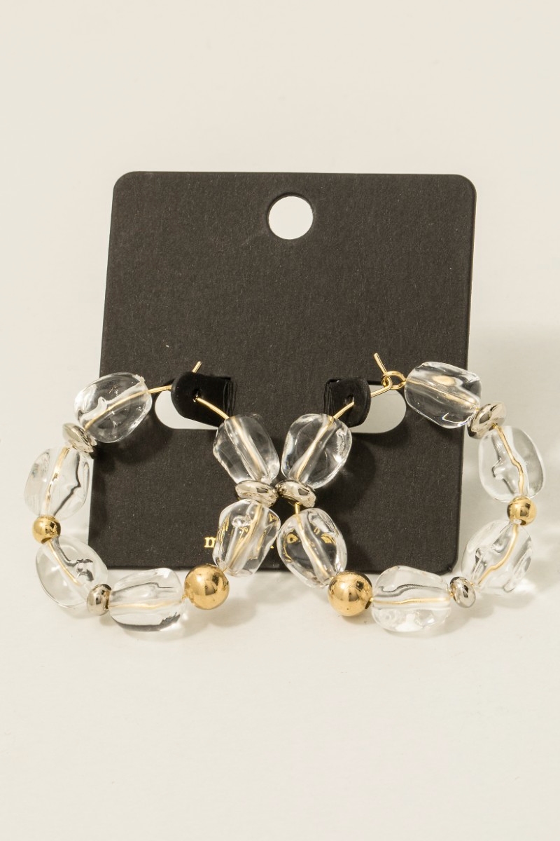 • This pair of hoop earrings adds a modern clear acrylic bead style. Indulge in the allure of exquisite craftsmanship as this pair of hoop earrings effortlessly adds a touch of luxury to your attire.