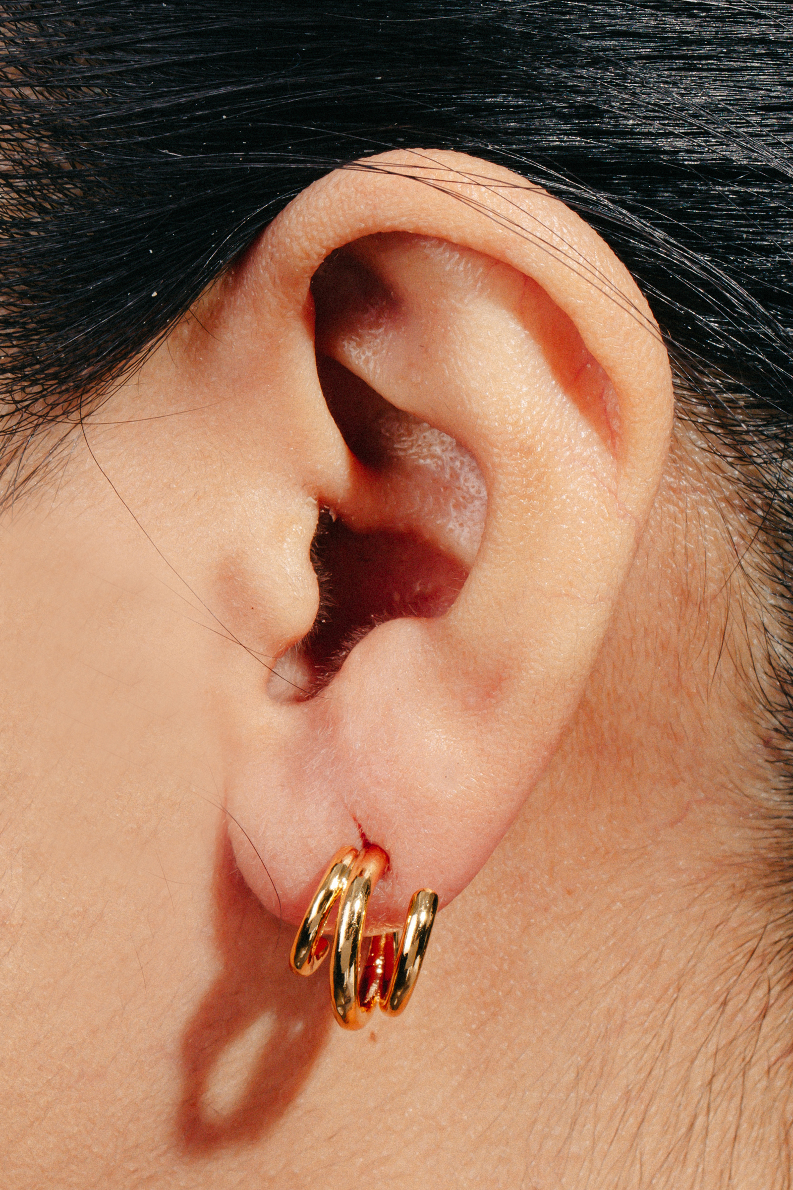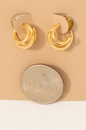 • This pair of hoop earrings adds a modern mini three layered style. Experience the joy of accessorizing with this piece that effortlessly combines versatility and charm.