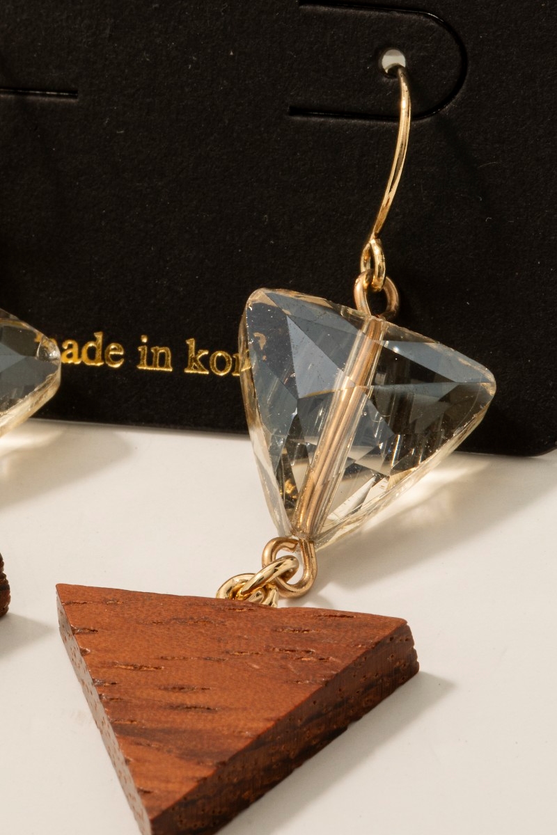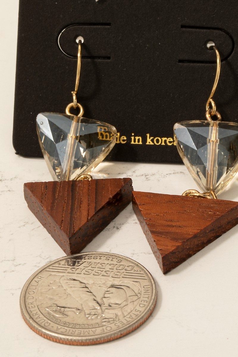 - This pair of dangle earrings features a fashionable wood and glass triangle style. Embark on a journey of sartorial refinement as this pair of dangle earrings effortlessly complements your fashion sense.