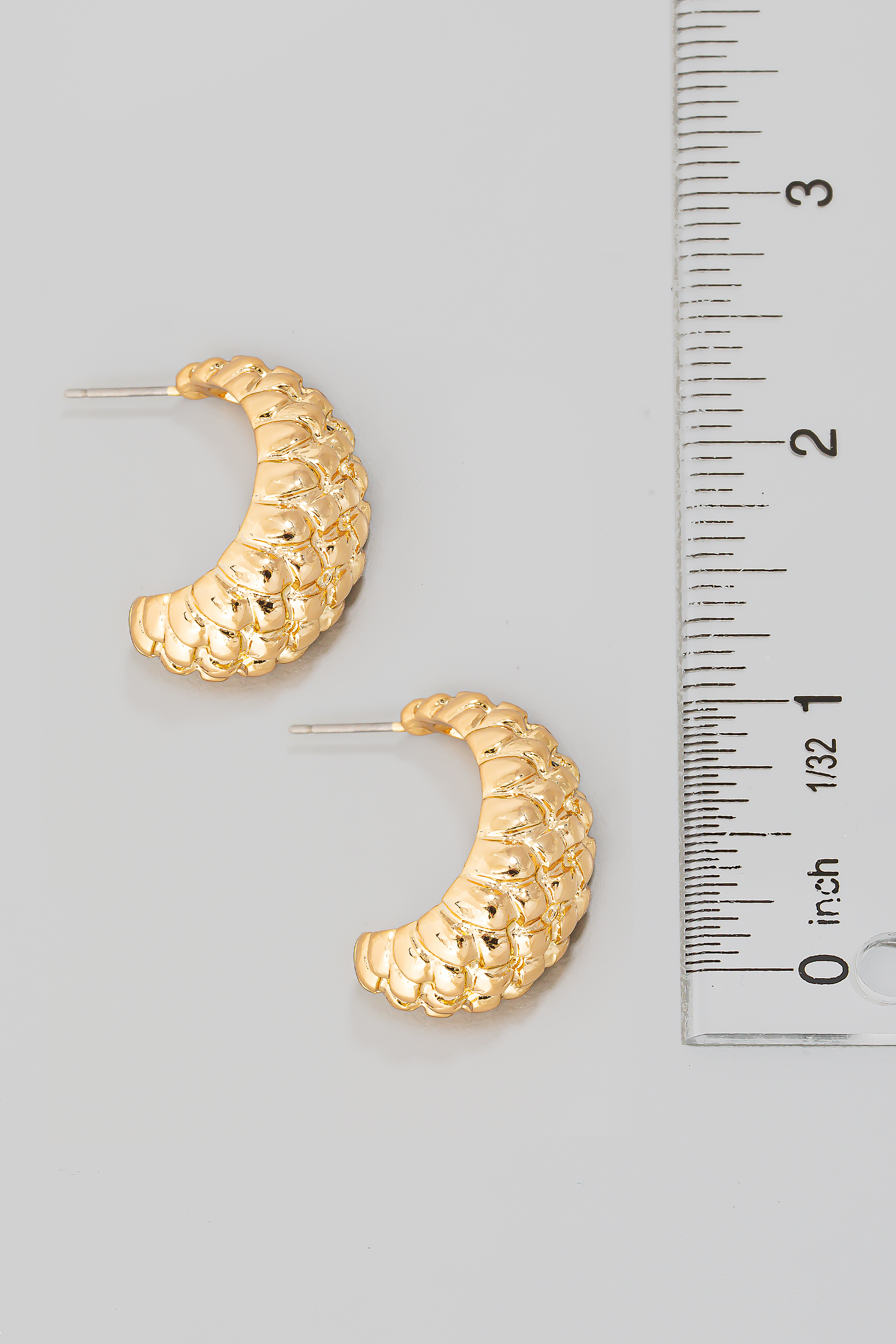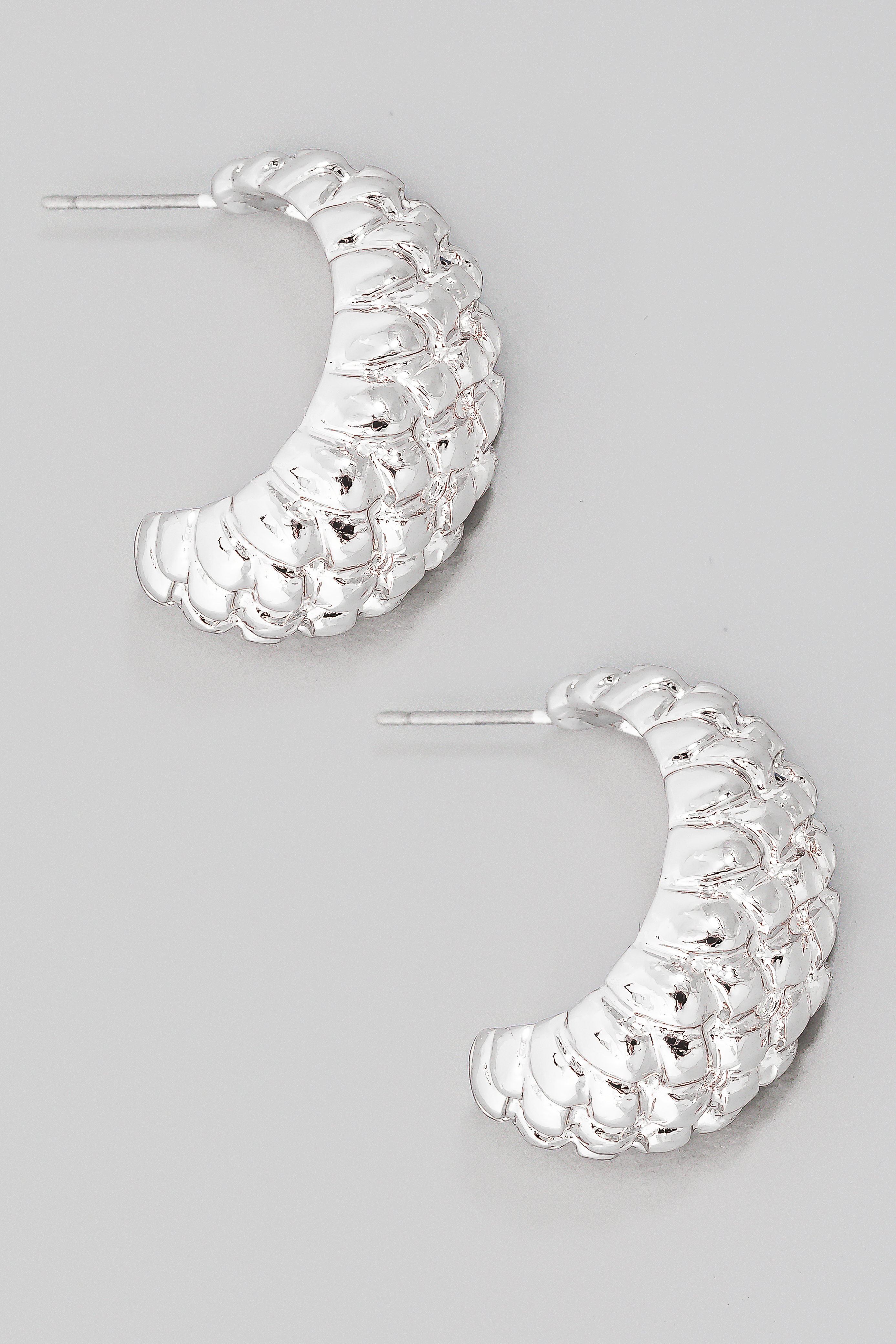 - This pair of hoop earrings showcases a unique metallic textured c style. Unveil a new dimension of sophistication as this accessory effortlessly enhances the elegance of your ensemble.