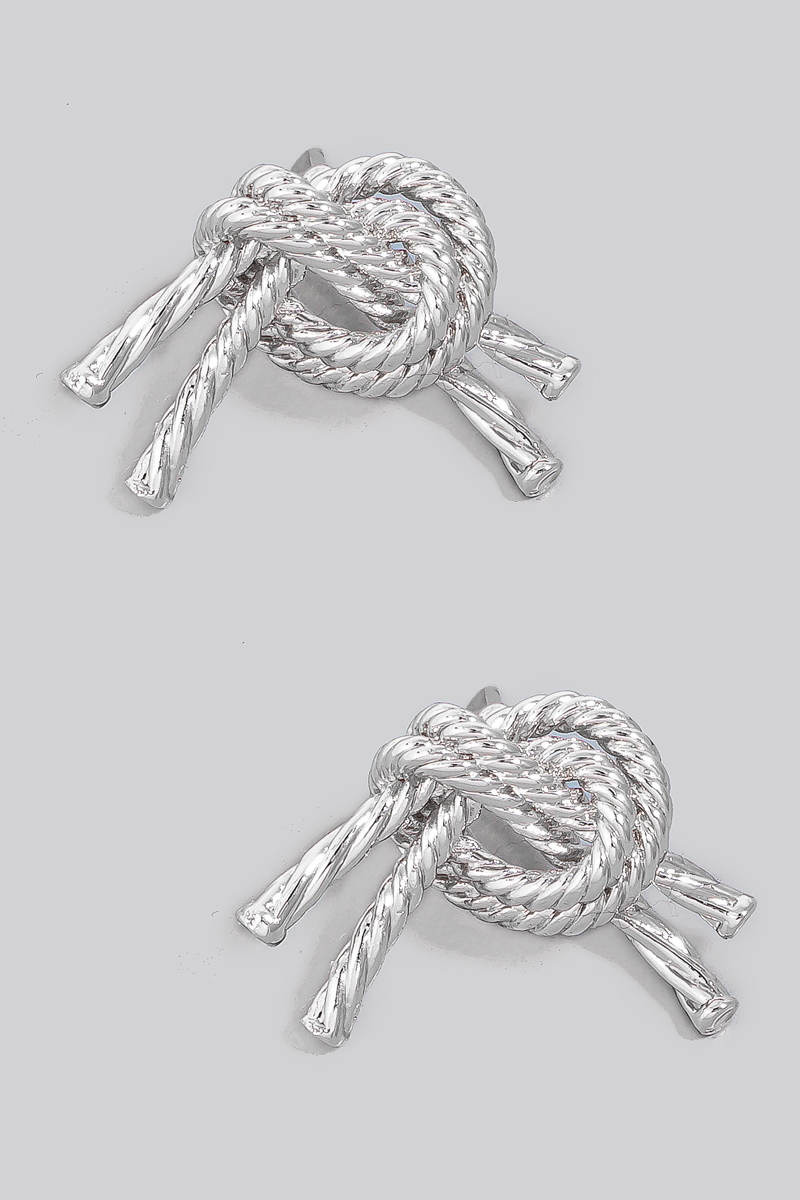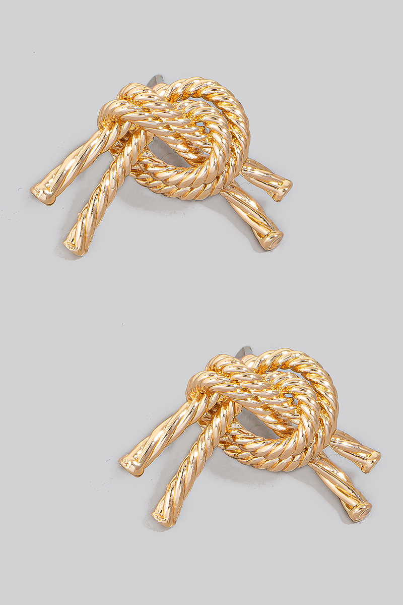 • This pair of stud earrings brings a stunning metallic tied rope knot style. Experience the joy of accessorizing with this piece that effortlessly combines versatility and charm.