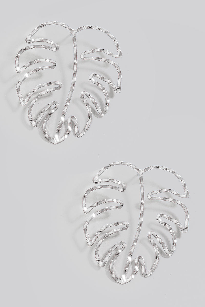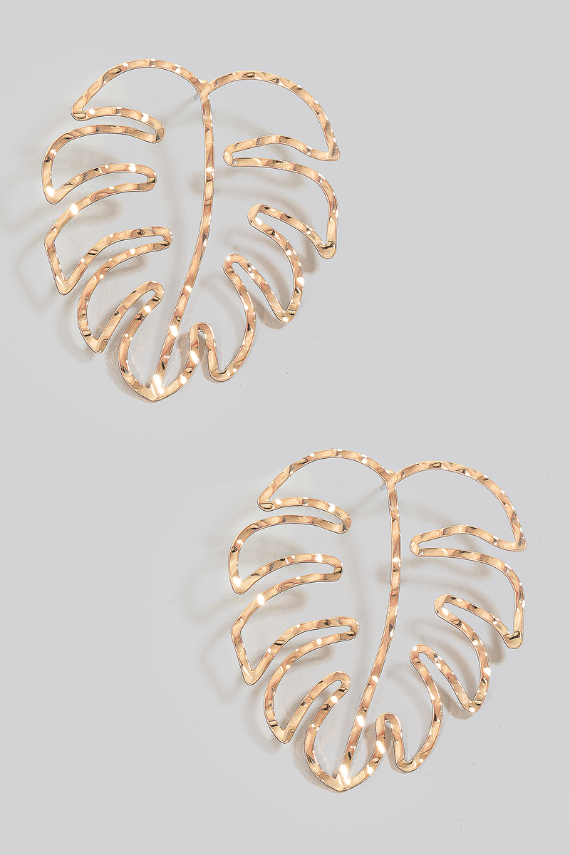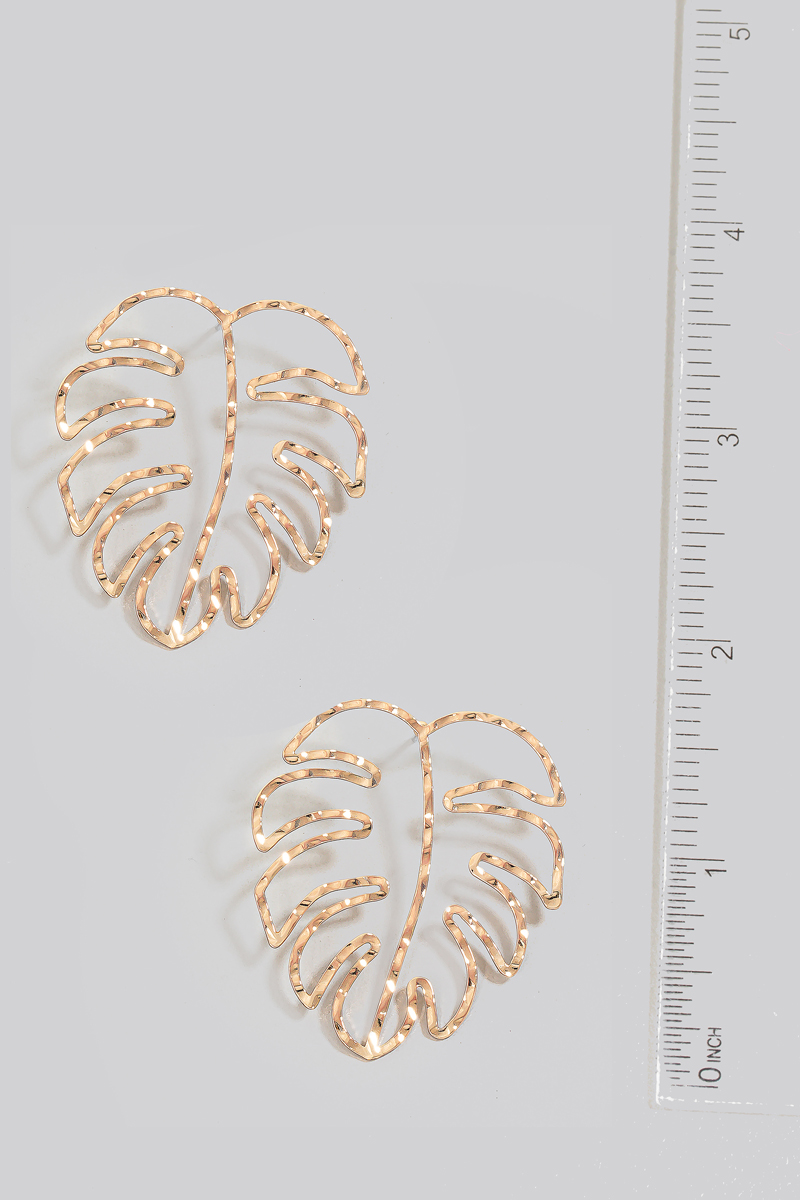 • This pair of drop earrings displays a fashionable metallic warped monstera leaf outline stud style. Discover the perfect balance of functionality and fashion.