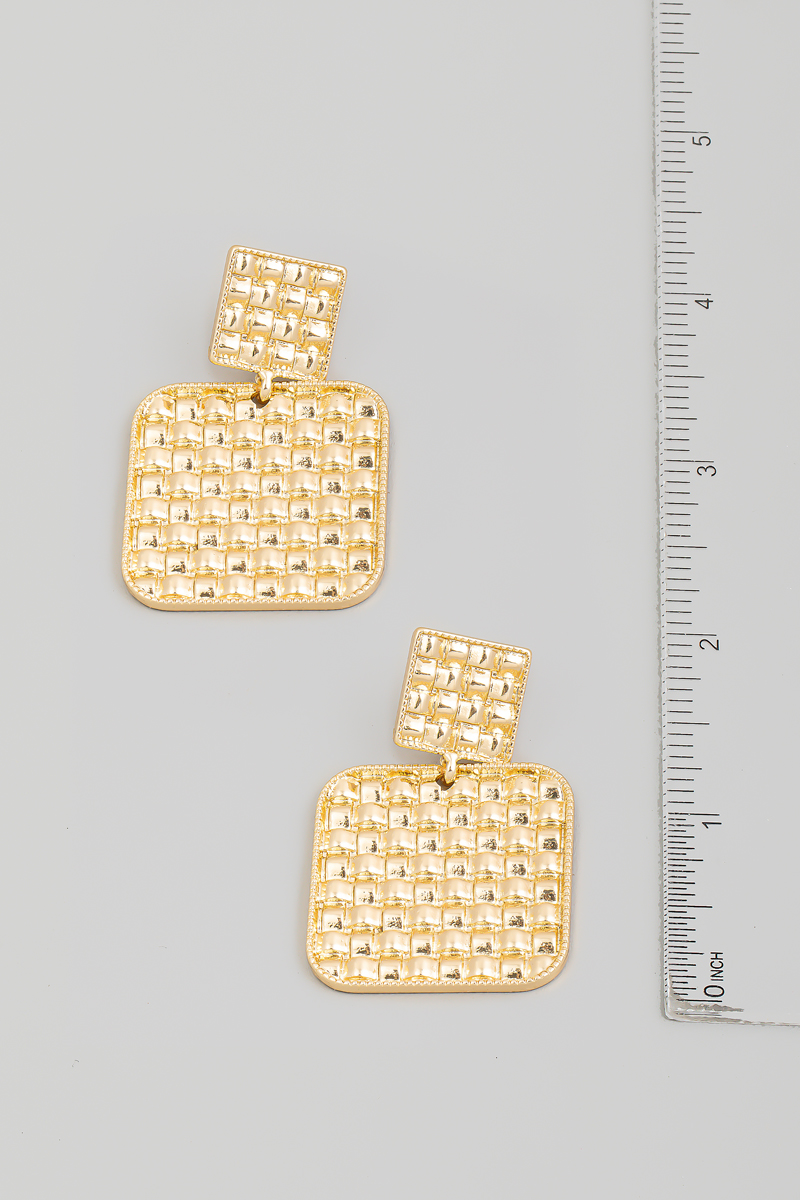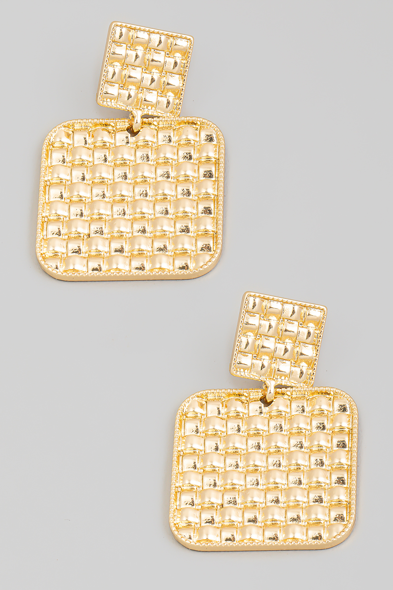 - Perfectly versatile and endlessly stylish, this pair of dangle earrings reveals an intricate metallic square basket weave dangle earrings design. This accessory is the perfect way to add a touch of elegance to any outfit. Available in G.