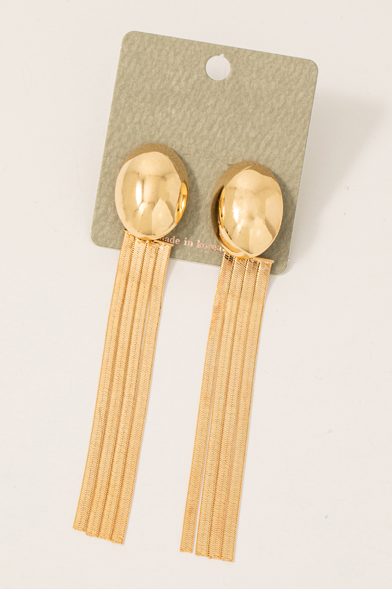 - This pair of drop earrings showcases a unique oval shield long flat chain fringe style. Celebrate individual style with this versatile, eye-catching addition.