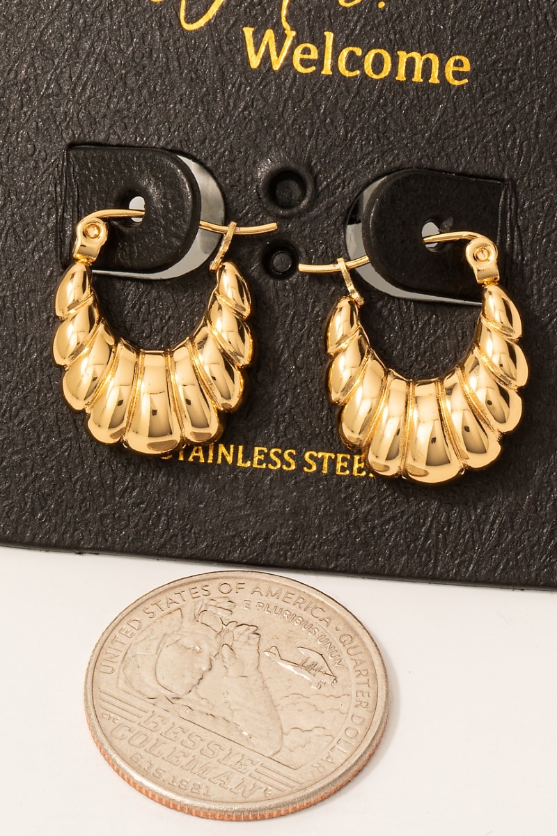 - This pair of hoop earrings introduces a unique stainless steel croissant latch style. Embark on a journey of sartorial refinement as this pair of hoop earrings effortlessly complements your fashion sense.
