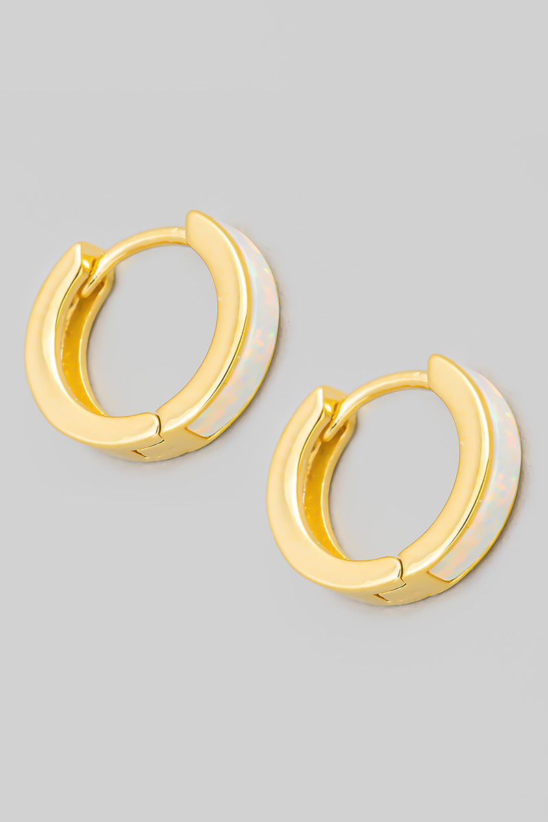 - This pair of hoop earrings brings a stunning opal mini huggie style. Embark on a journey of sartorial refinement as this pair of hoop earrings effortlessly complements your fashion sense.