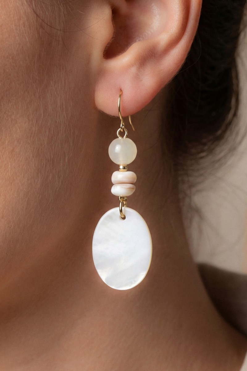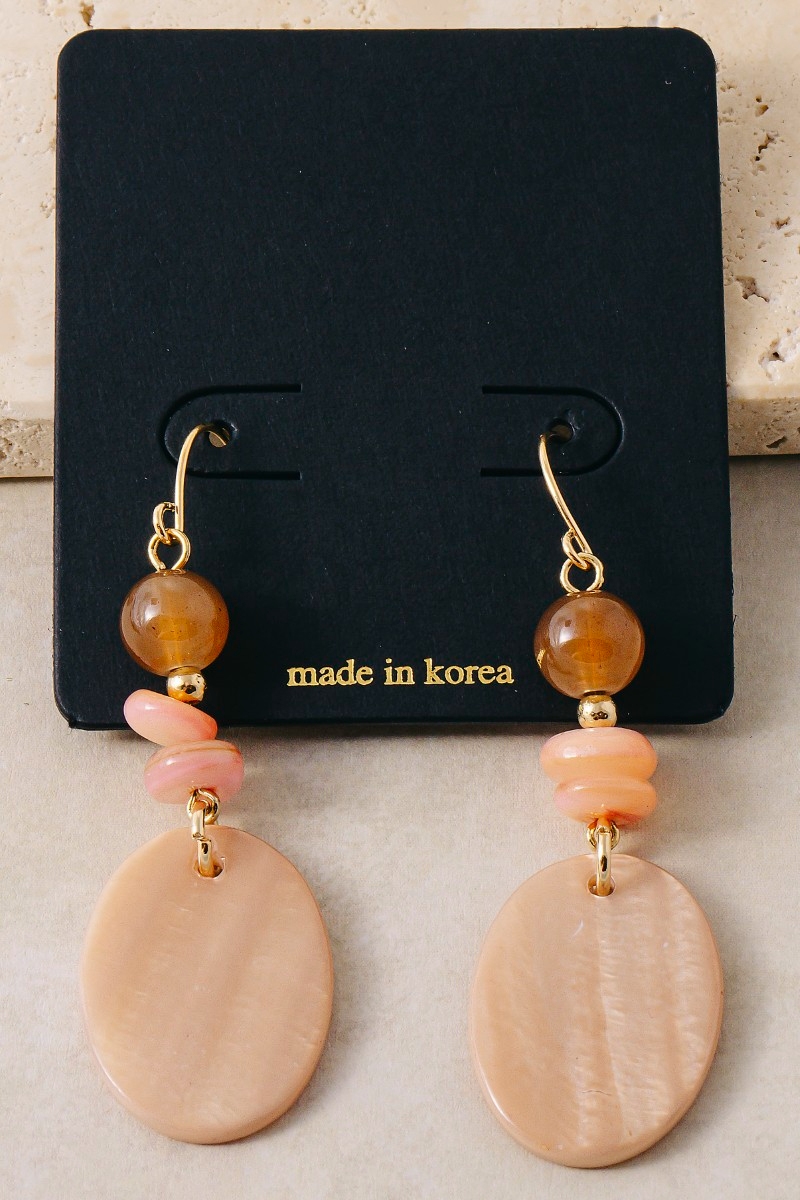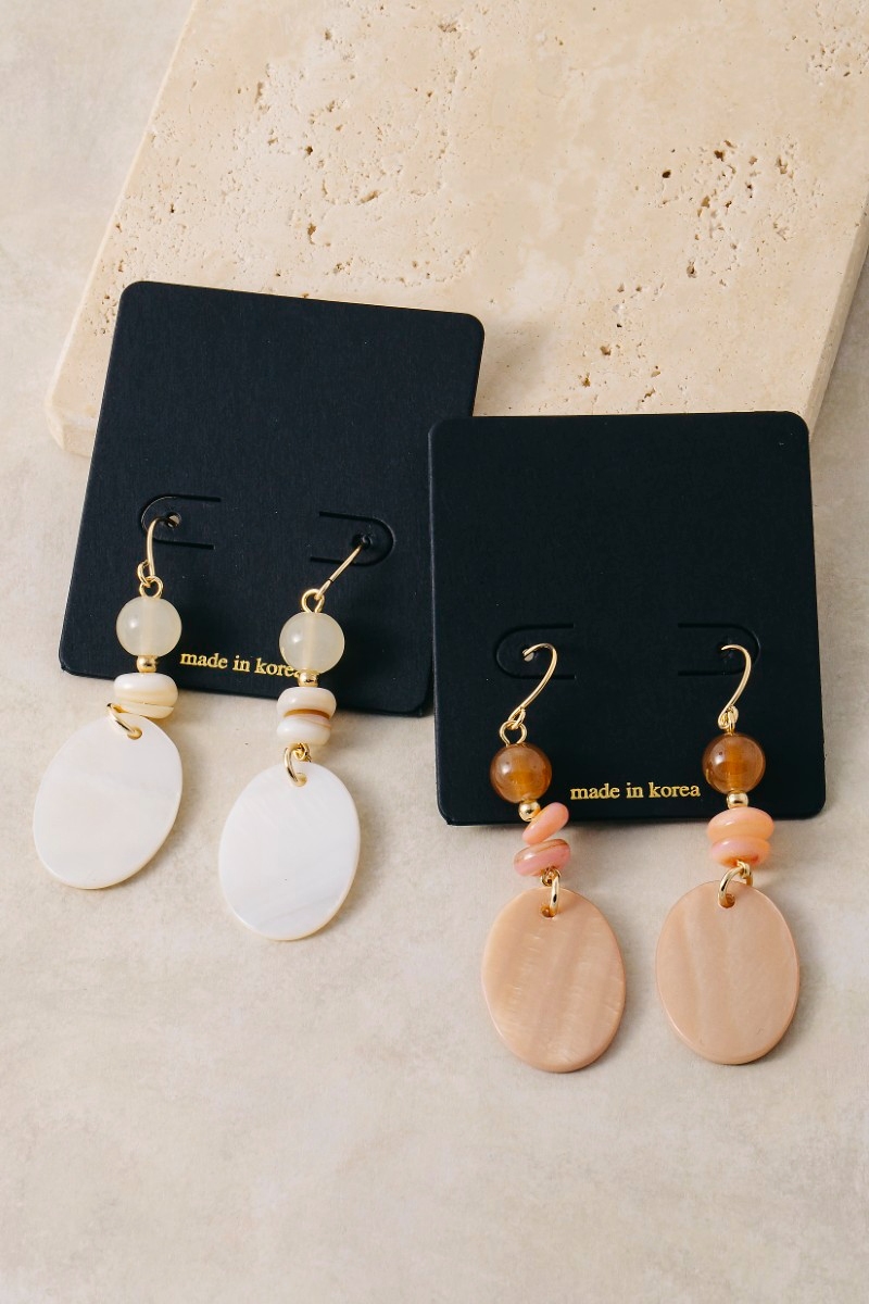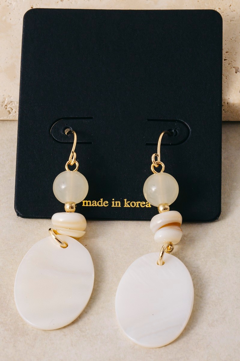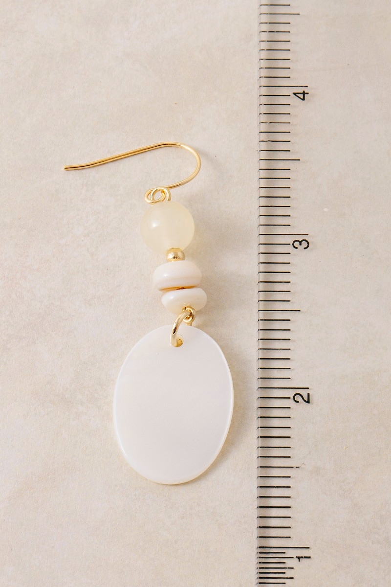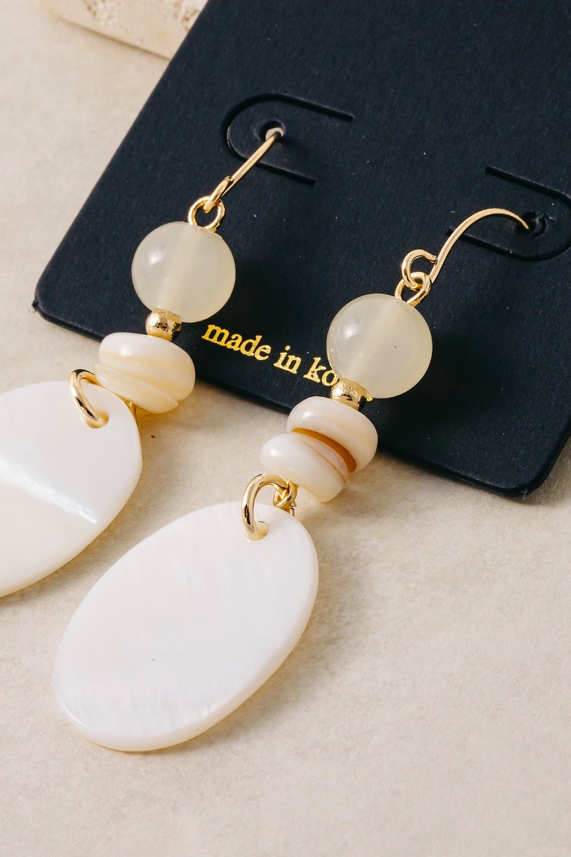 • This pair of dangle earrings features a fashionable oval sea shell and beads style. Experience a subtle blend of modernity and classic charm as this pair of dangle earrings effortlessly adorns your ensemble.