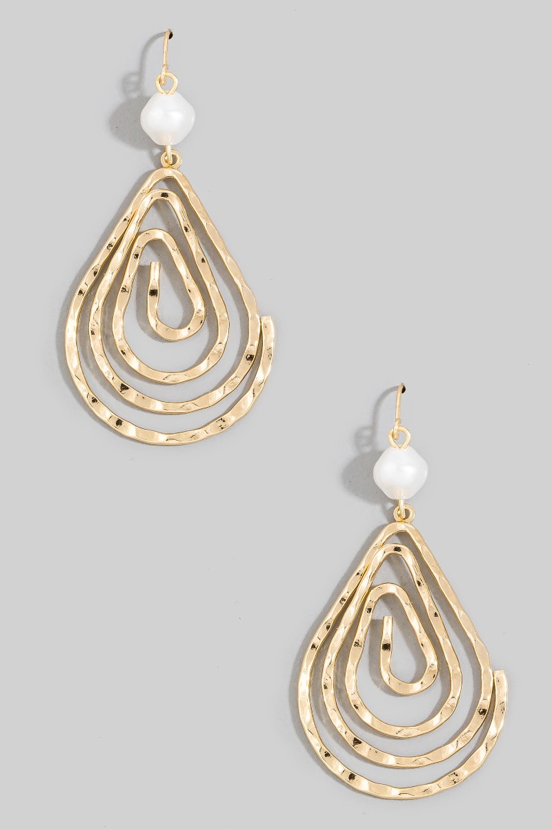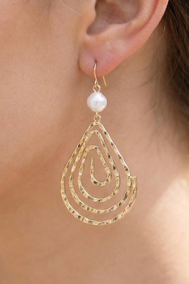 - This pair of dangle earrings displays a fashionable pearl bead spiral hammered tear style. Witness the transformative power of accessories as this piece effortlessly redefines your fashion narrative.
