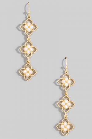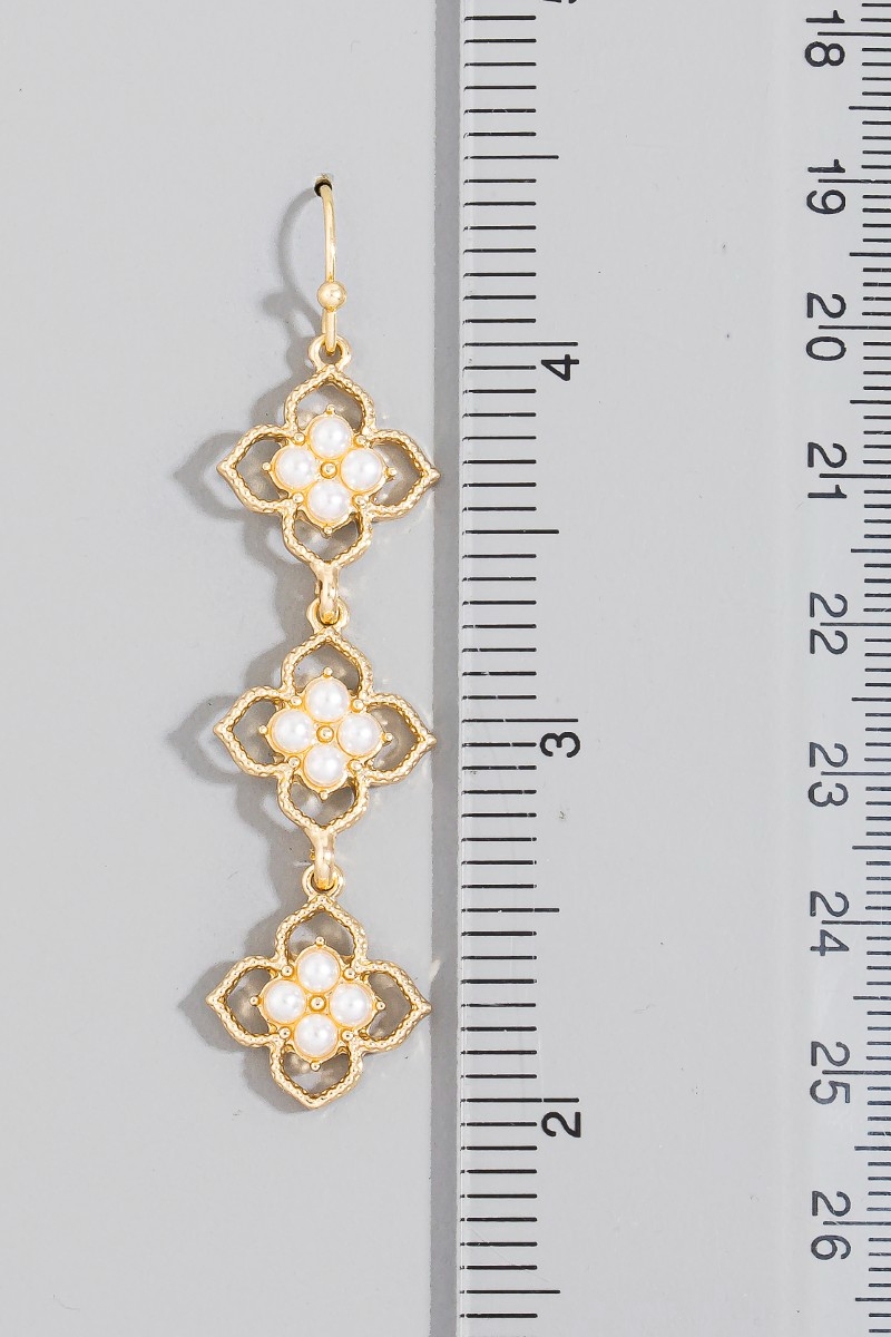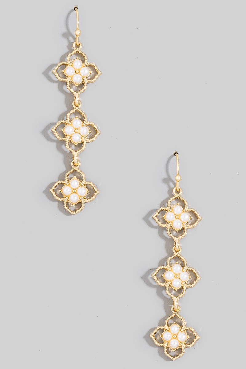 • This pair of dangle earrings introduces a unique pearl studded multi flower chain style. Elevate your ensemble with this chic, timeless pair of dangle earrings.