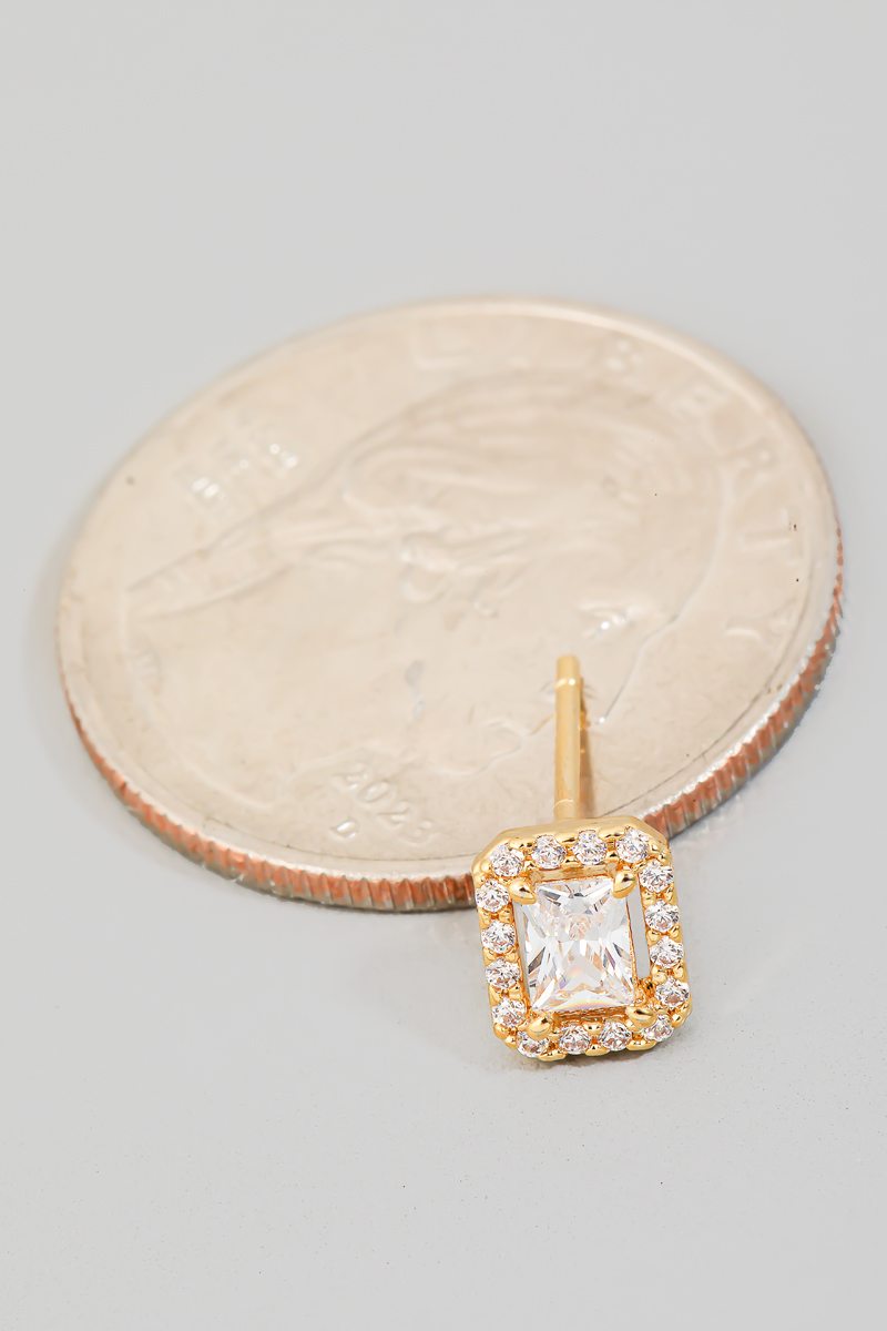 • This pair of stud earrings brings a unique rectangle rhinestone style. Revel in the intricate design that effortlessly distinguishes this accessory, making it a statement piece.