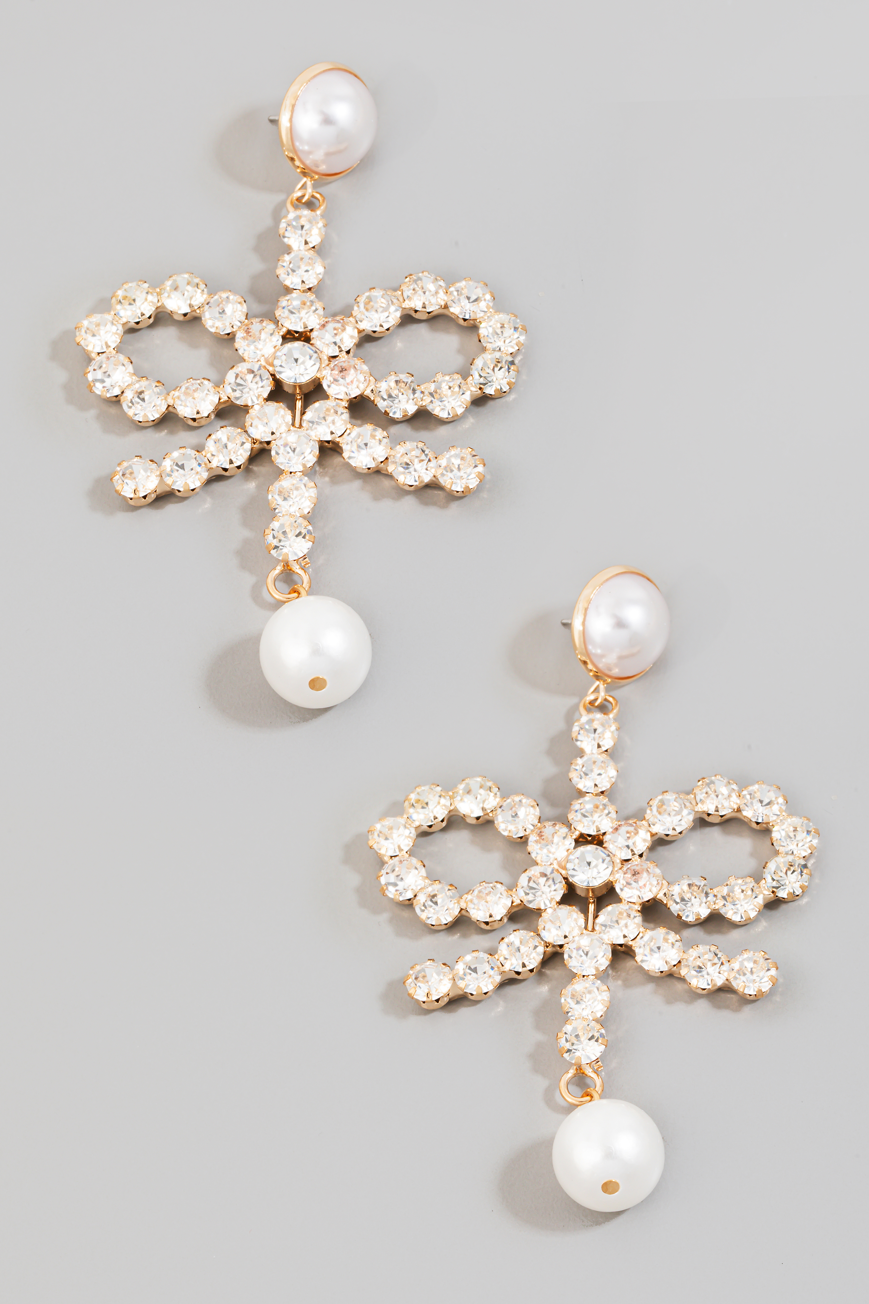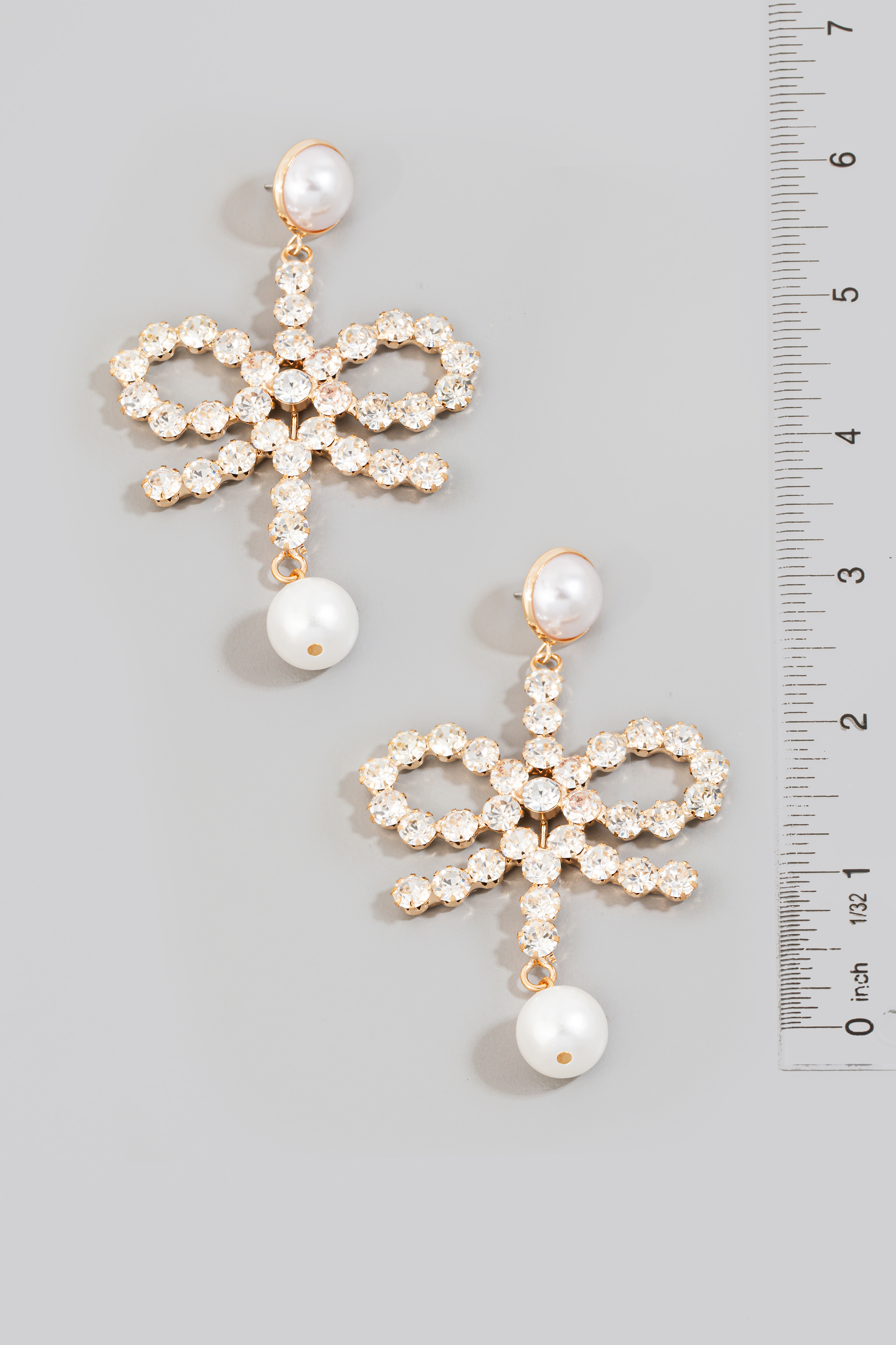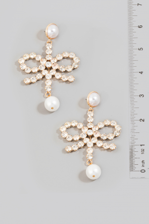 • This pair of dangle earrings introduces a stunning rhinestone and pearl ribbon bow style. Witness the perfect fusion of style and functionality as this accessory effortlessly complements your lifestyle.