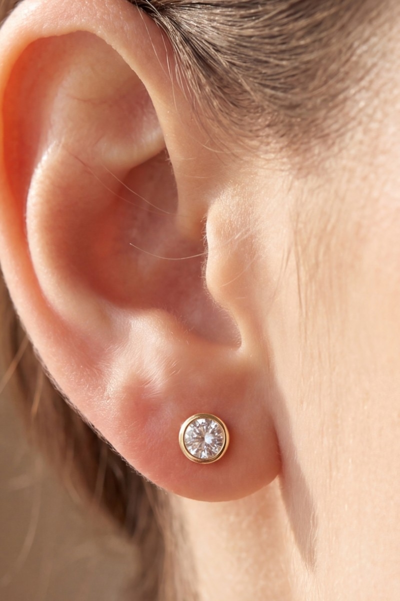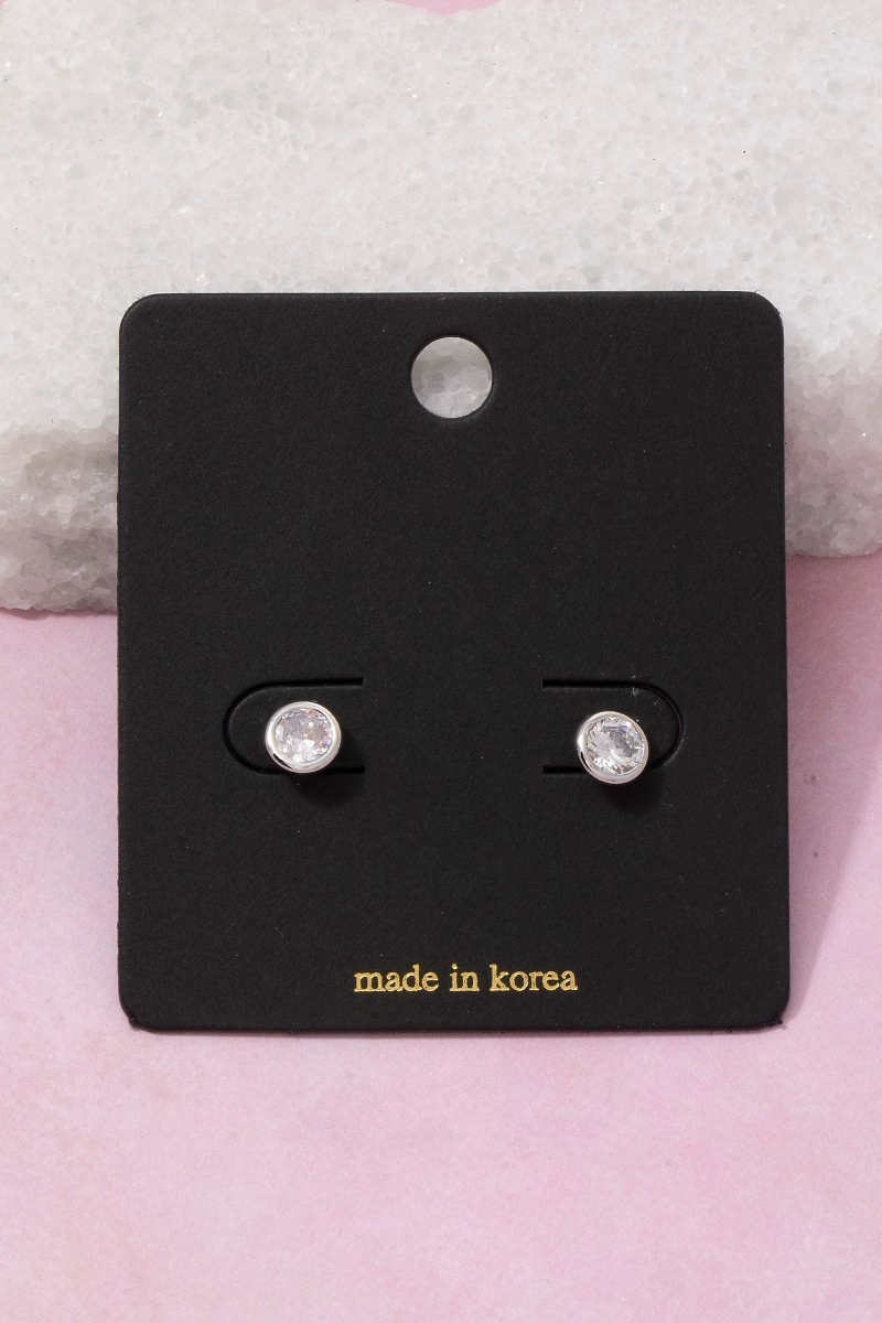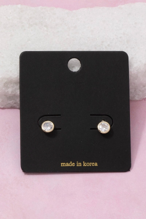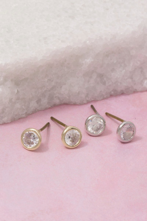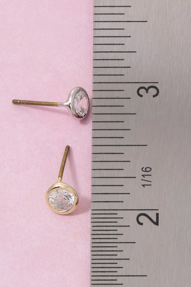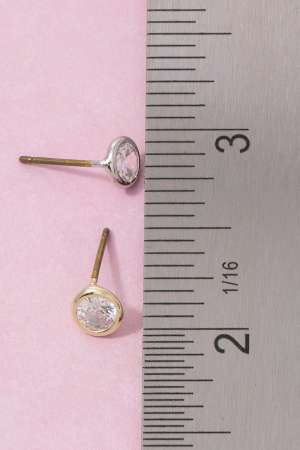 - This pair of stud earrings introduces a unique round cubic zirconia bezel style. Celebrate the art of accessorizing with this piece that effortlessly encapsulates modern trends.