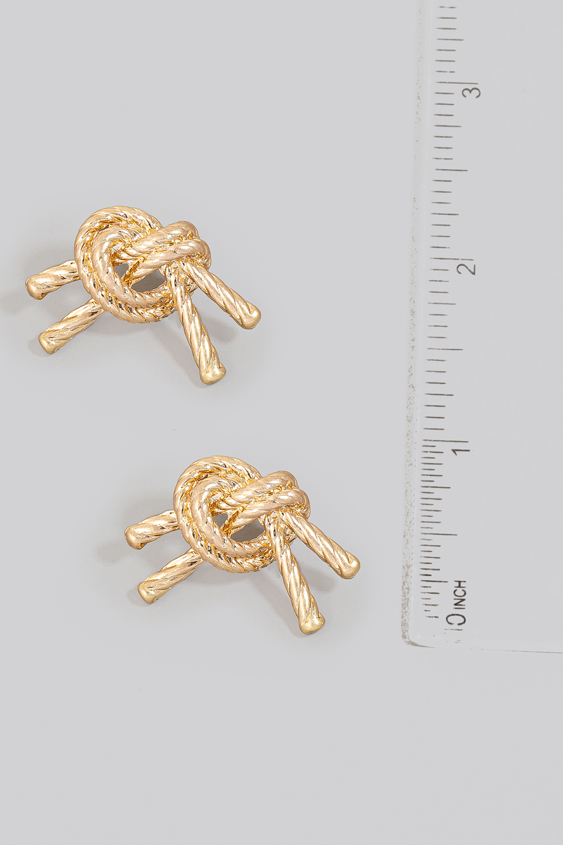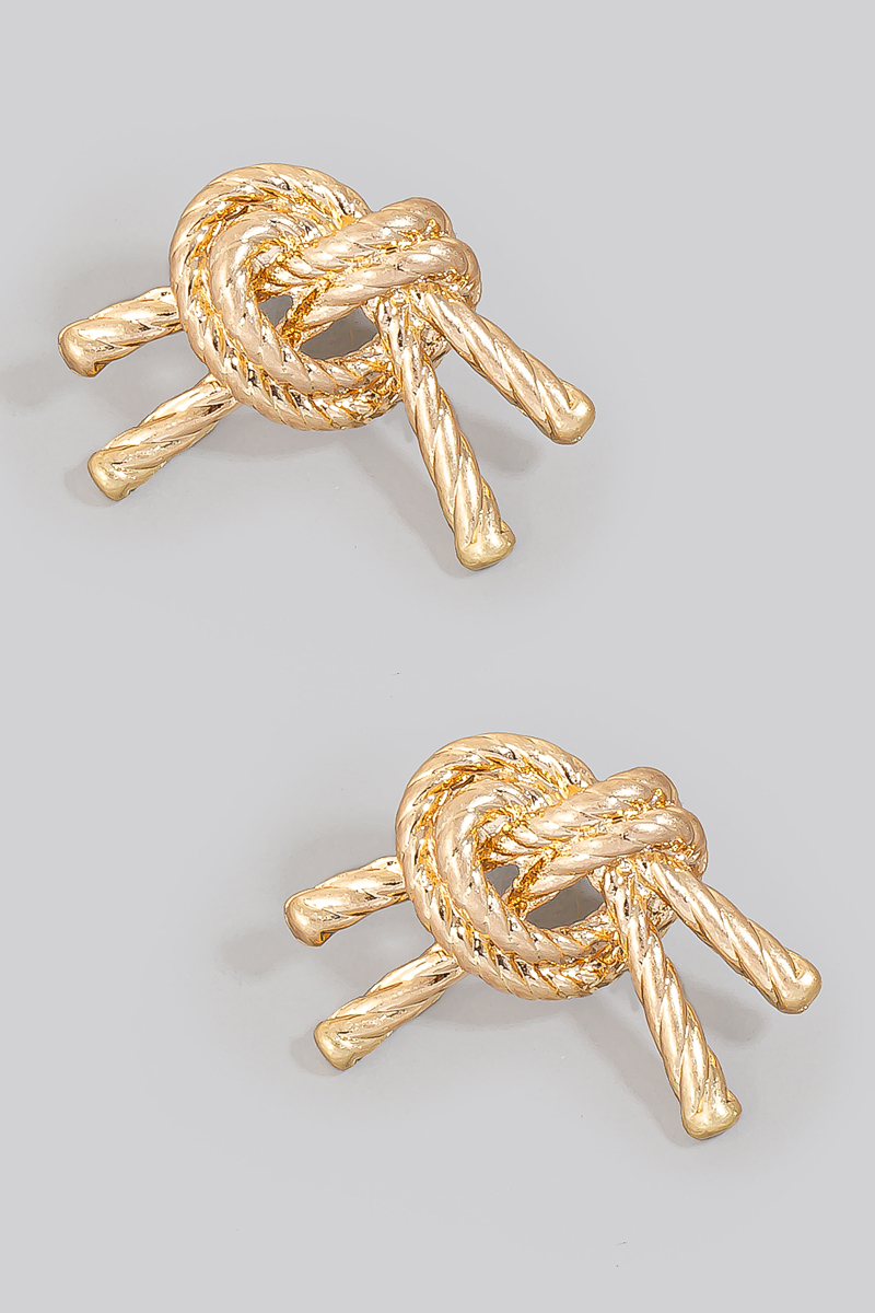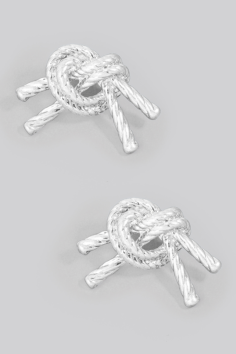 • This pair of stud earrings showcases a unique solid metallic rope knot style. Delight in the nuanced details that make this pair of stud earrings a testament to fine design and impeccable taste.
