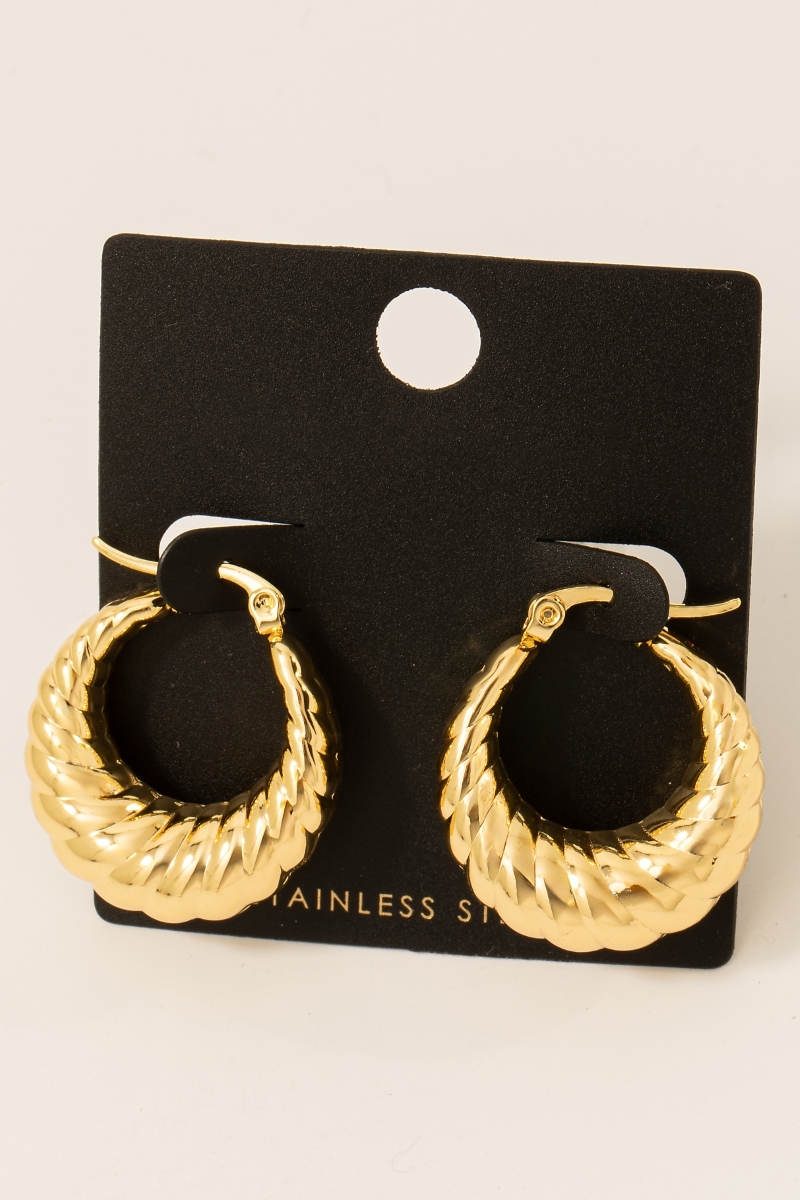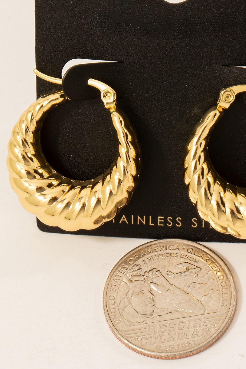 - This pair of hoop earrings introduces a stunning stainless steel croissant style. Witness the transformative power of accessories as this piece effortlessly redefines your fashion narrative.