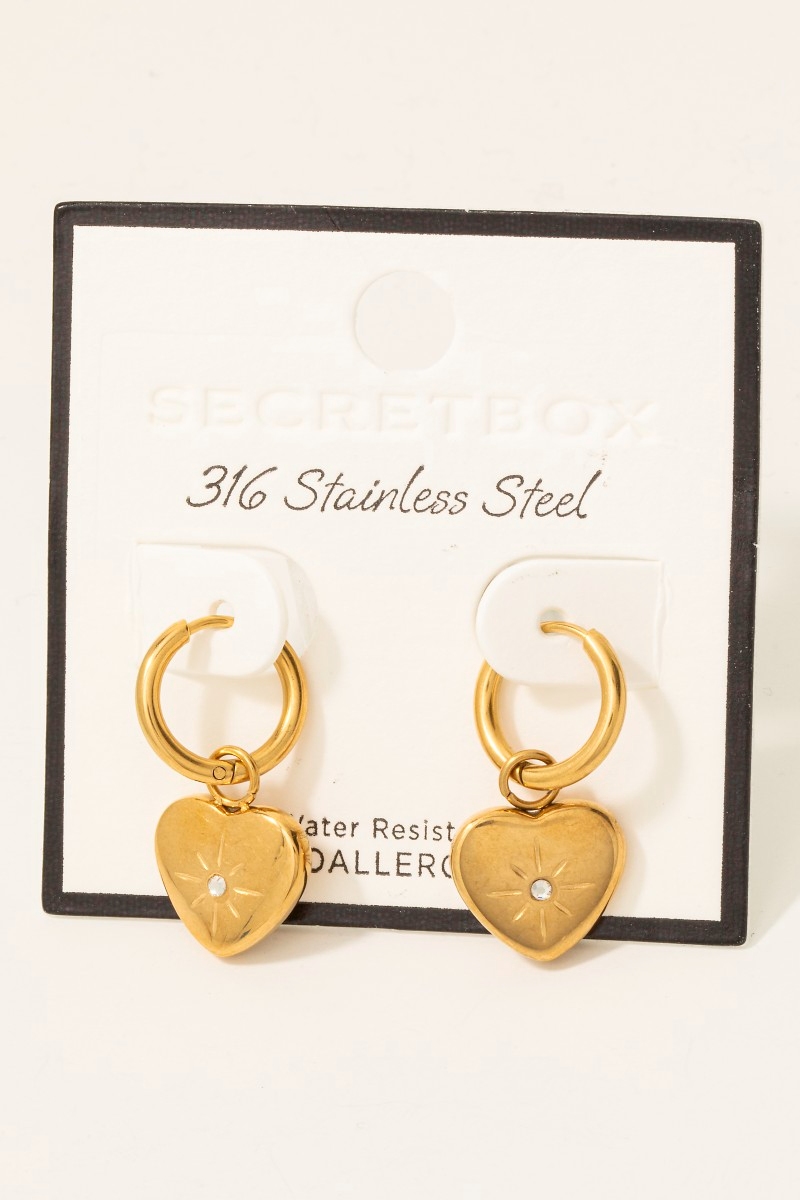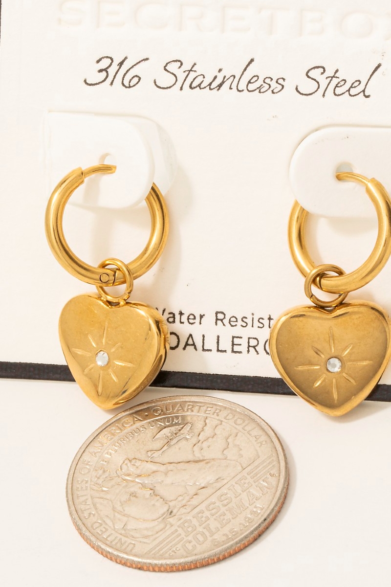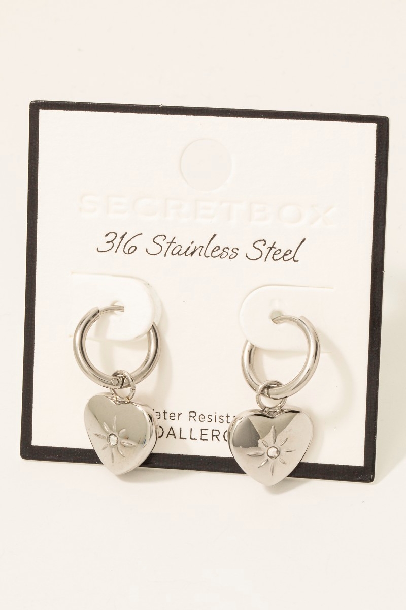 • This pair of hoop earrings introduces a unique stainless steel heart charm style. Step into a world of refined taste as this pair of hoop earrings effortlessly refines the details of your outfit.