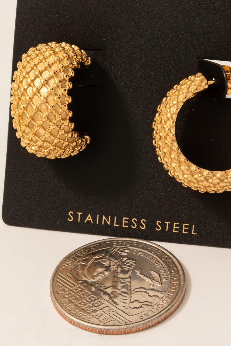 - This pair of hoop earrings showcases a timeless stainless steel mesh pattern wide style. Indulge in the allure of exquisite craftsmanship as this pair of hoop earrings effortlessly adds a touch of luxury to your attire.