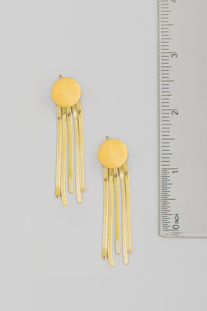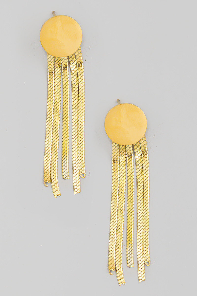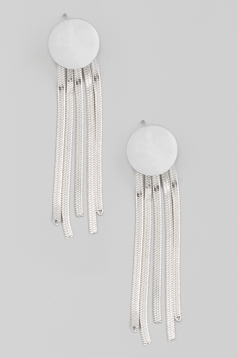 • This pair of earrings introduces a stunning stainless steel snake chain fringe disc style. Celebrate individuality with this pair of earrings that effortlessly expresses your unique sense of style.