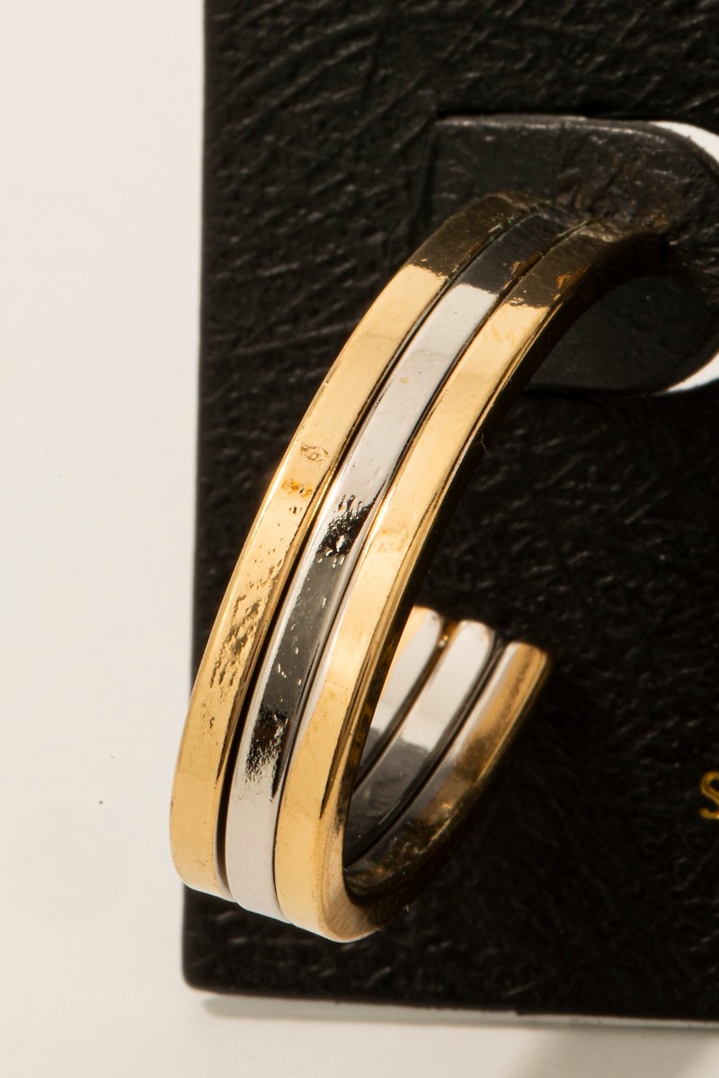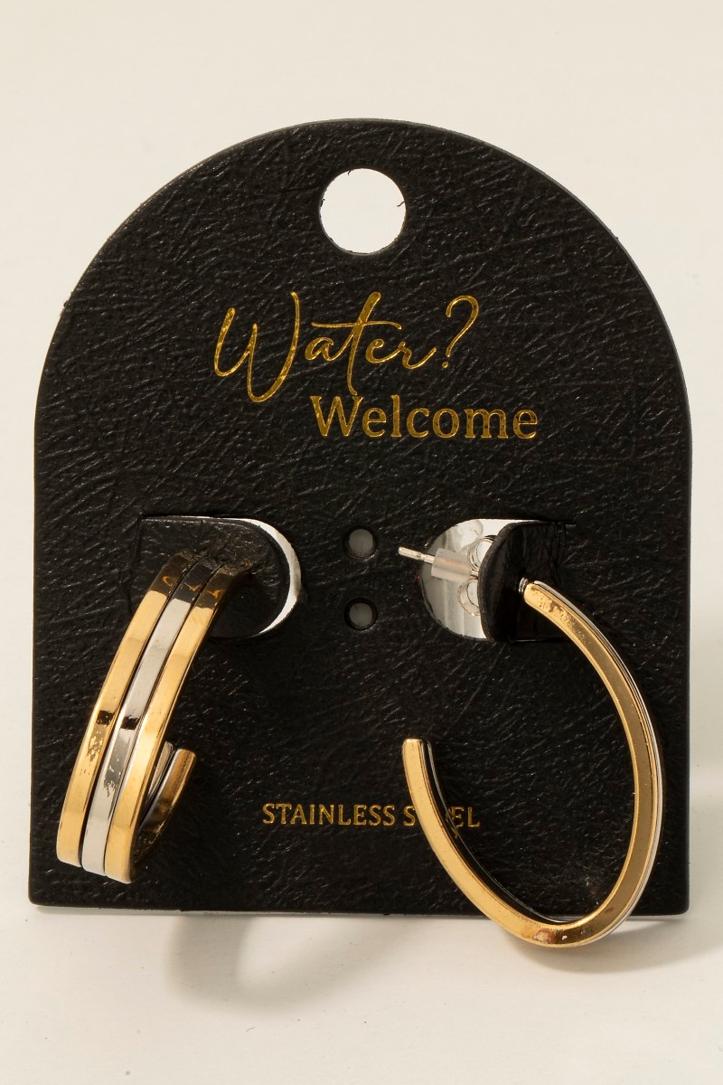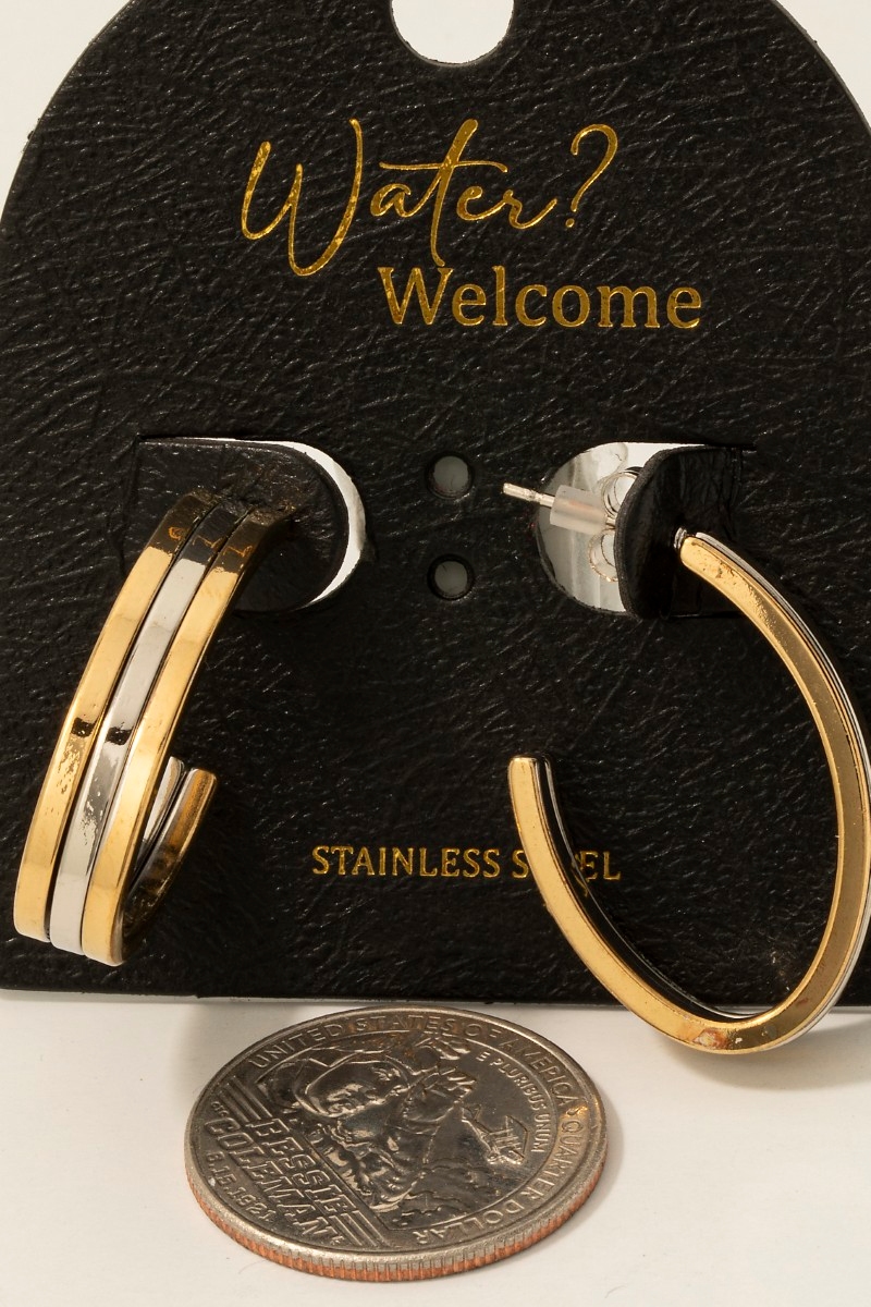 - This pair of hoop earrings displays a vibrant two tone stainless steel wide layered style. Indulge in the allure of exquisite craftsmanship as this pair of hoop earrings effortlessly adds a touch of luxury to your attire.