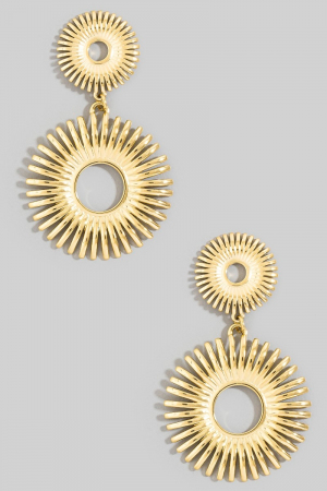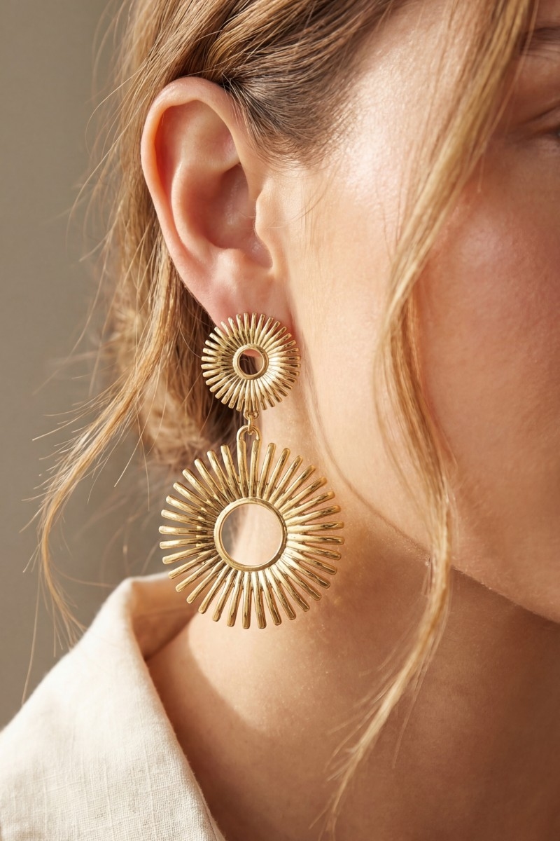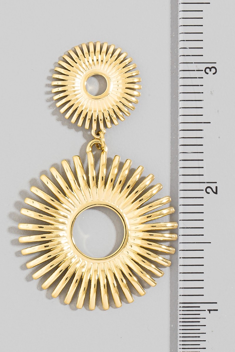 • This pair of earrings showcases a timeless stainless steel sunburst double drop statement style. Experience the joy of accessorizing with this piece that effortlessly combines versatility and charm.