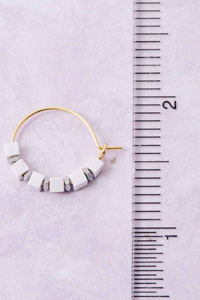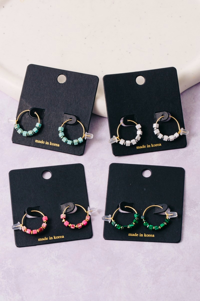 - This pair of hoop earrings introduces a stunning stone cube beads dainty wire style. Immerse yourself in the world of understated glamour as this pair of hoop earrings effortlessly exudes timeless appeal.