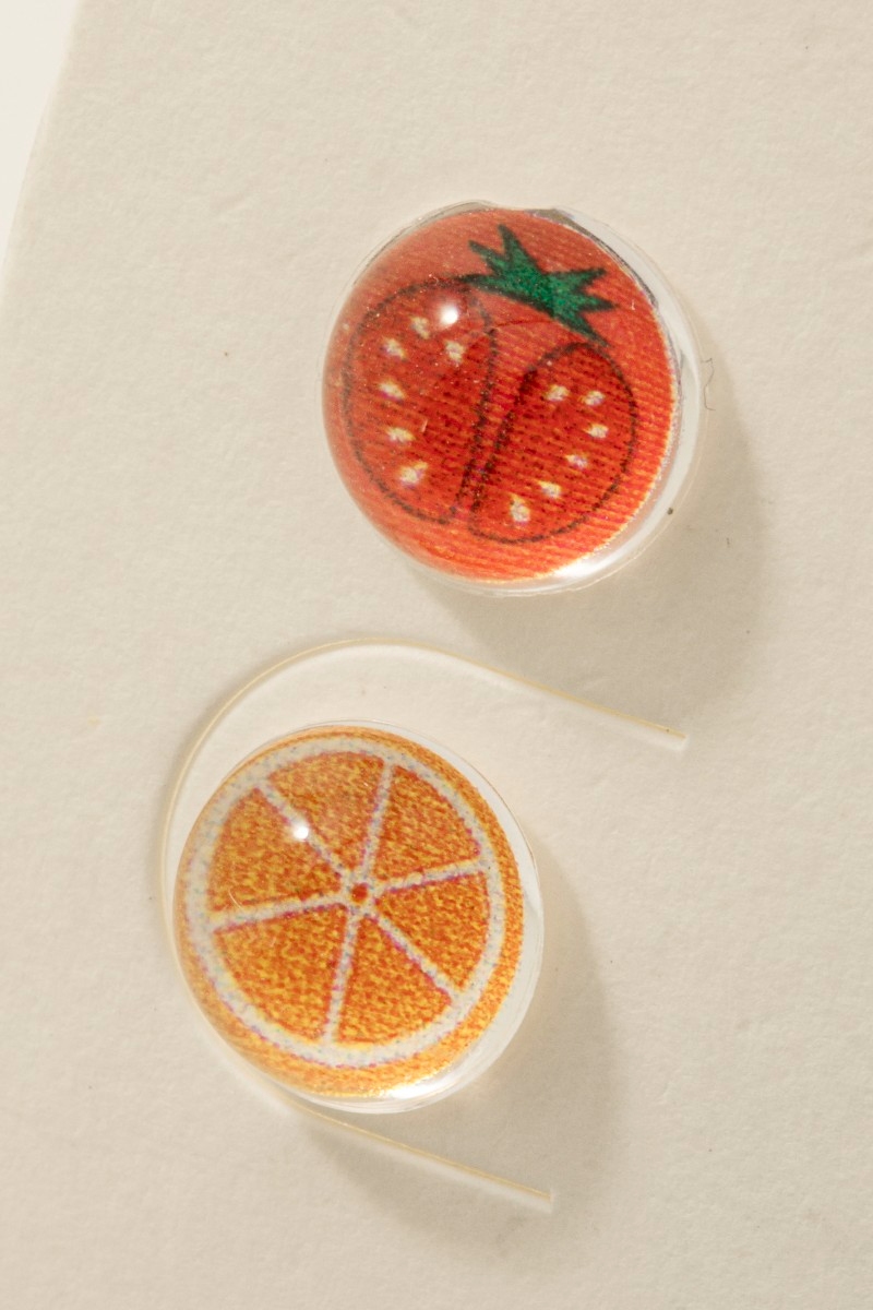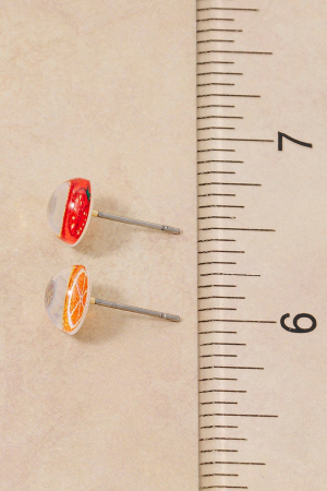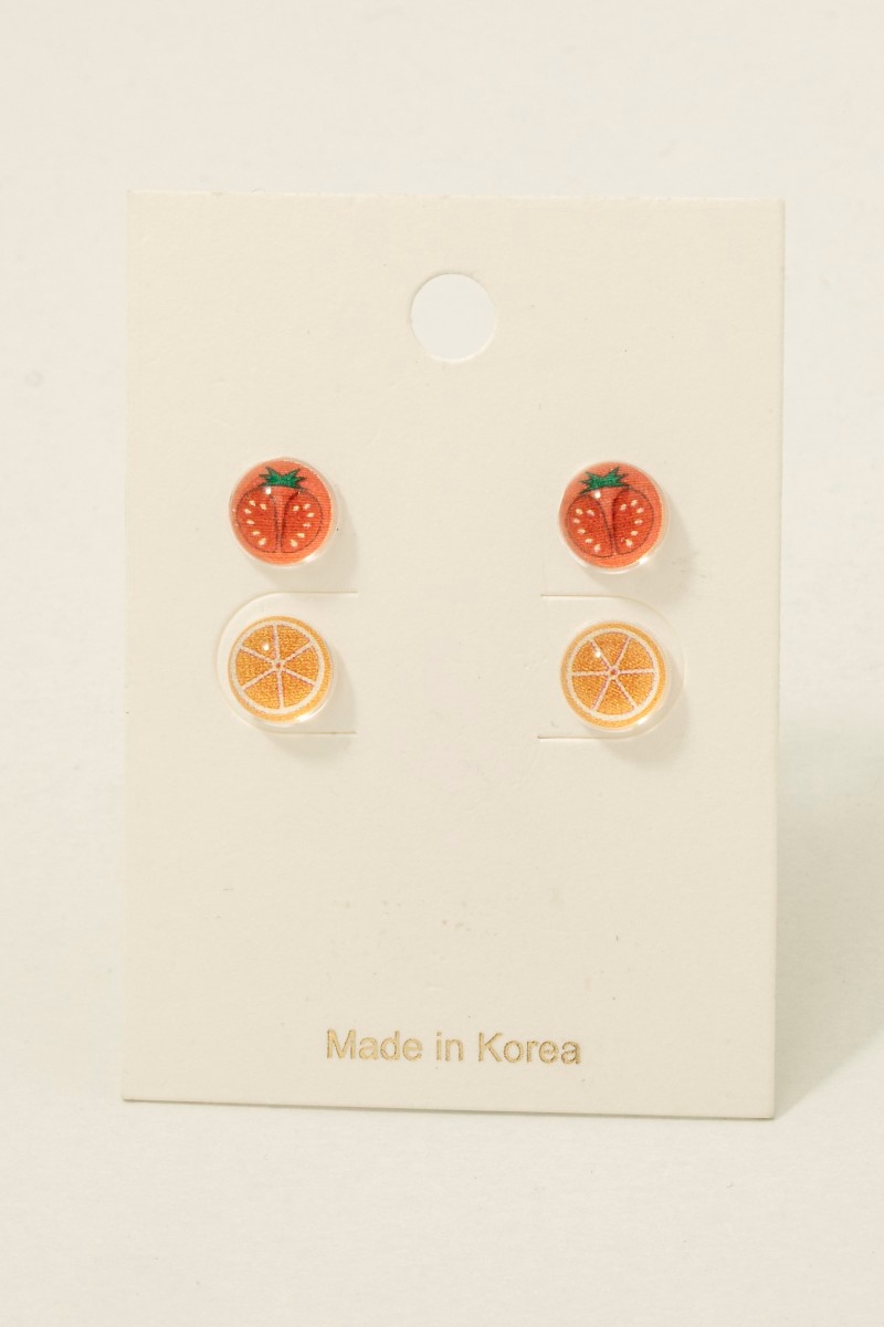 • This pair of stud earrings showcases a unique acrylic tomato and orange set style. Witness the perfect fusion of style and functionality as this pair of stud earrings effortlessly complements your lifestyle.