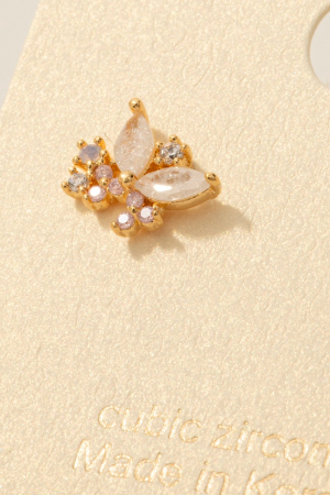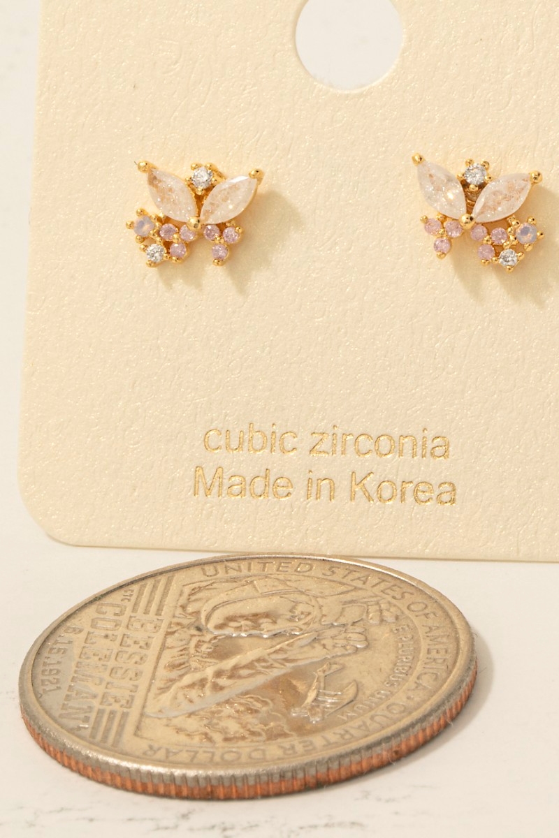 • This pair of stud earrings introduces a stunning gold dipped cubic zirconia cluster butterfly style. Embark on a journey of sartorial refinement as this pair of stud earrings effortlessly complements your fashion sense.