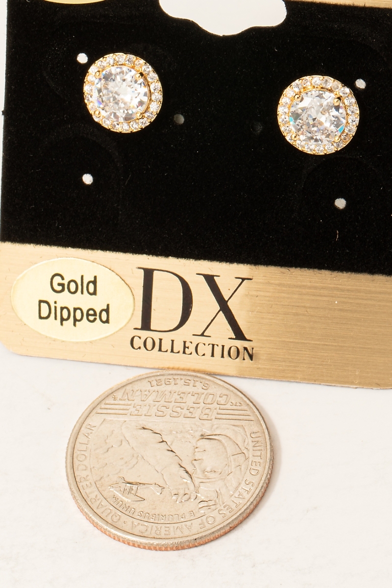 • This pair of stud earrings brings a luxurious gold dipped cubic zirconia halo set style. Witness the perfect fusion of style and functionality as this pair of stud earrings effortlessly complements your lifestyle.