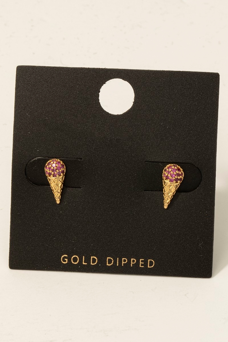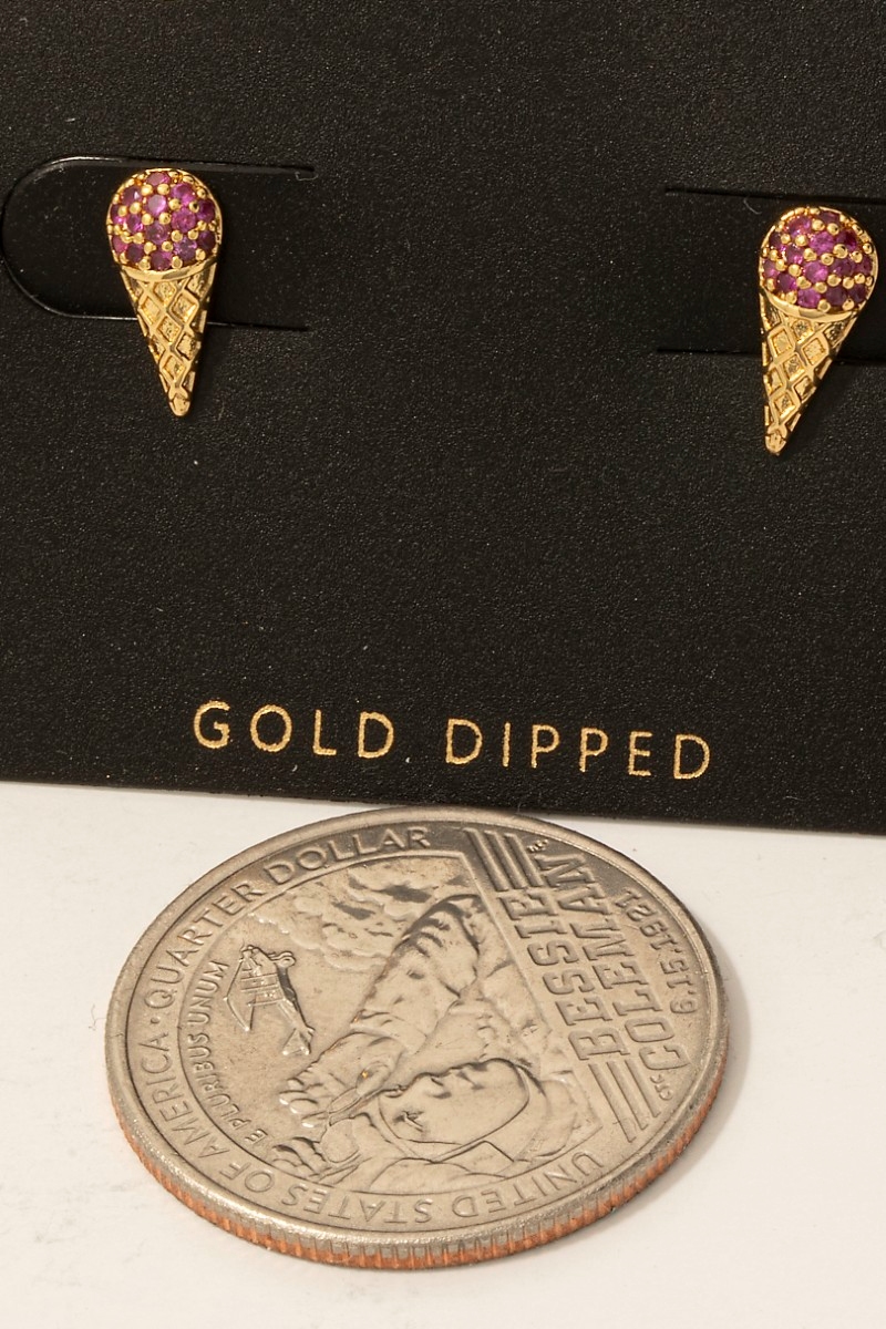 • This pair of stud earrings showcases a unique gold dipped cubic zirconia pave ice cream cone style. Immerse yourself in the world of understated glamour as this pair of stud earrings effortlessly exudes timeless appeal.